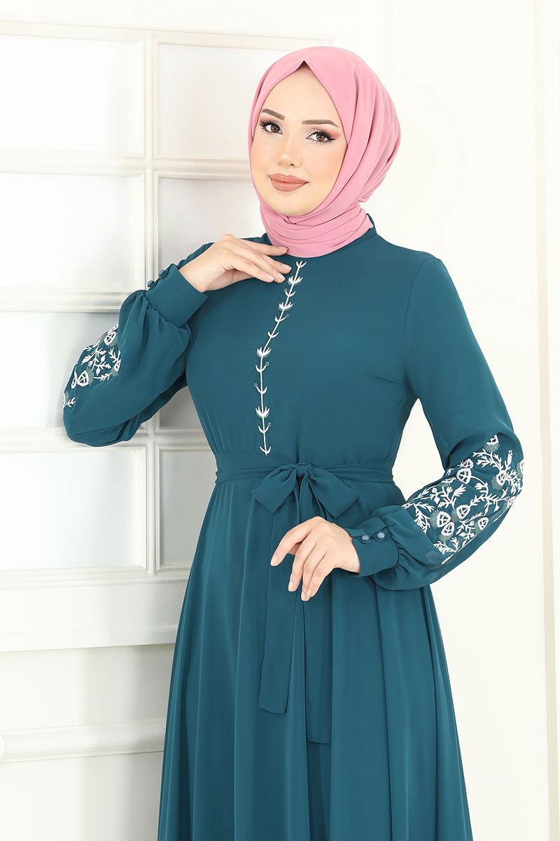 The Embroidered Chiffon Dress combines elegance and comfort, making it an ideal choice for modest attire throughout the seasons. Noteworthy for its delicate and sophisticated details, this dress can be cleaned with a gentle wash at 30 degrees Celsius. Its soft chiffon fabric and mandarin collar design offer an elegant appearance, while its lined structure increases comfort. This model, which features a zipper at the back, dazzles with its embroidery details. The included belt adds to its elegance, helping it maintain shape, while the functional cuff buttons stand out as a practical feature.