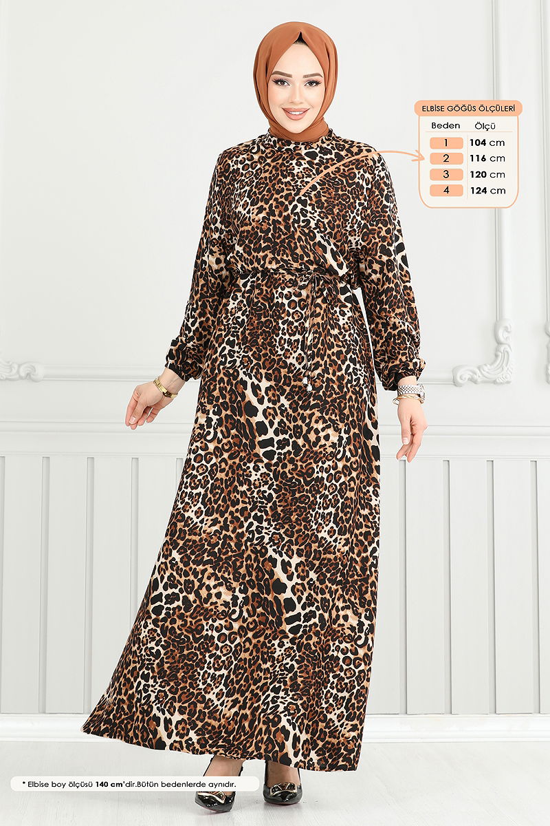 Reflect your modern and elegant choices with our Leopard Pattern Viscose Dress, suitable for all seasons. This hijab-style dress offers the comfort and soft touch of viscose fabric and should be hand washed. It features a semi-mandarin collar creating an elegant look, and a back zipper for easy wear. Its unlined structure and elastic cuffs allow for comfortable movement. The belt, with ends stitched together for a clean look, can be optionally used, providing a unique style flexibility.