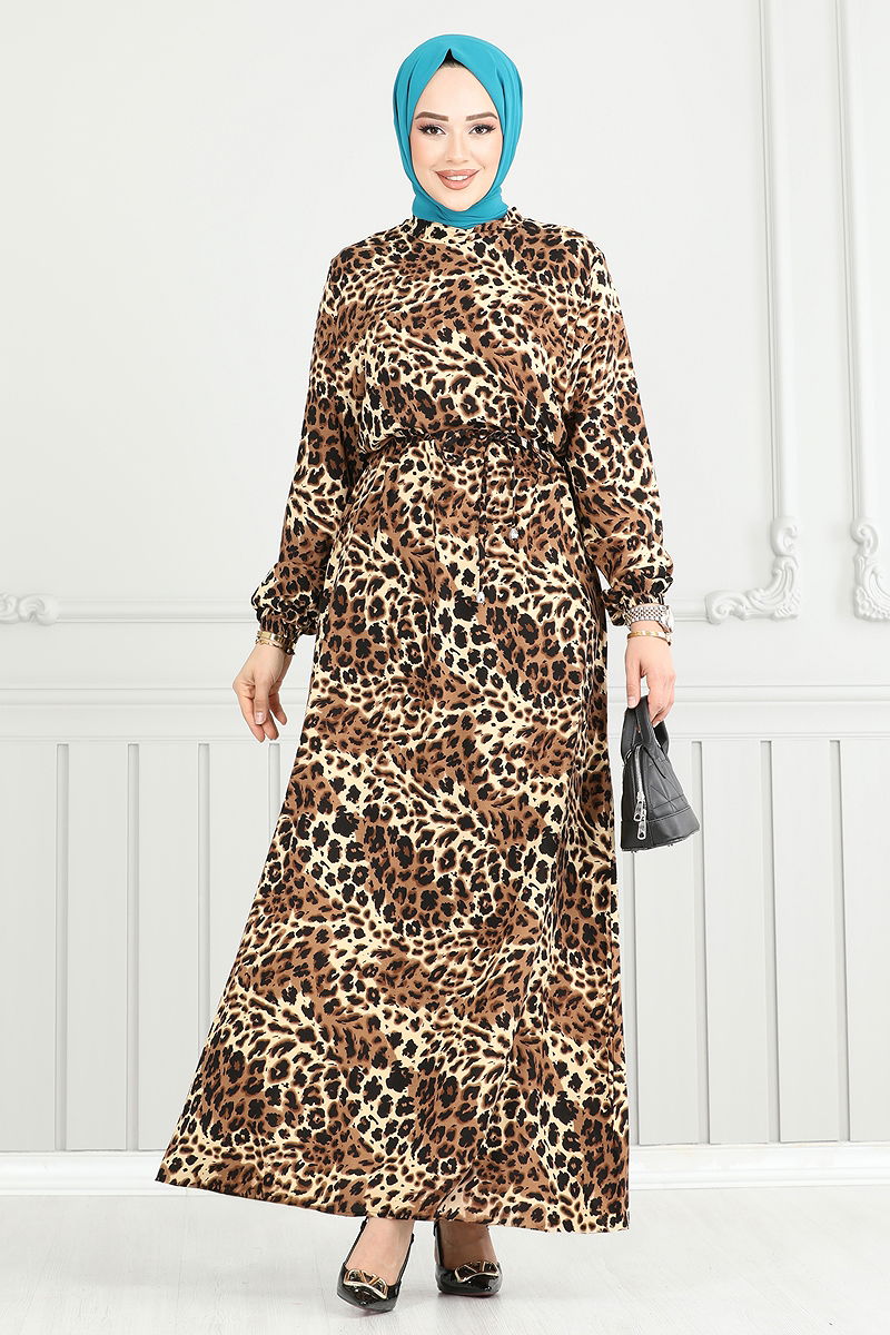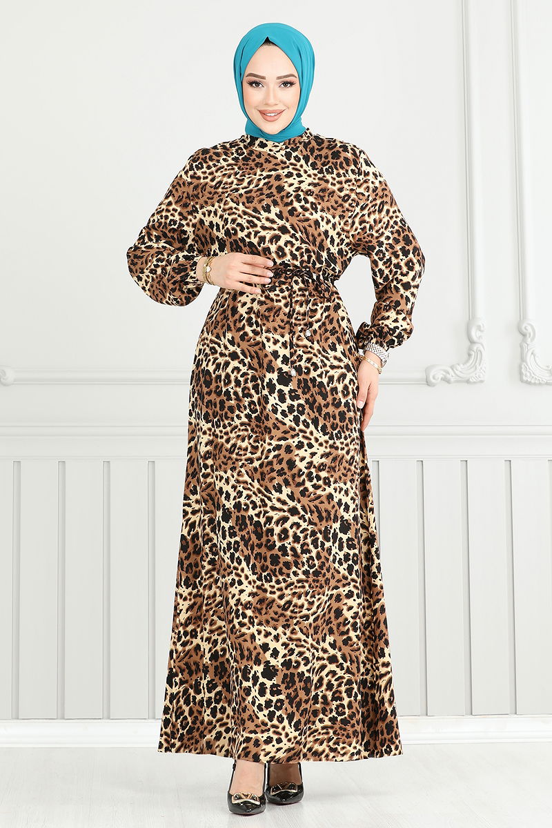 Reflect your modern and elegant choices with our Leopard Pattern Viscose Dress, suitable for all seasons. This hijab-style dress offers the comfort and soft touch of viscose fabric and should be hand washed. It features a semi-mandarin collar creating an elegant look, and a back zipper for easy wear. Its unlined structure and elastic cuffs allow for comfortable movement. The belt, with ends stitched together for a clean look, can be optionally used, providing a unique style flexibility.
