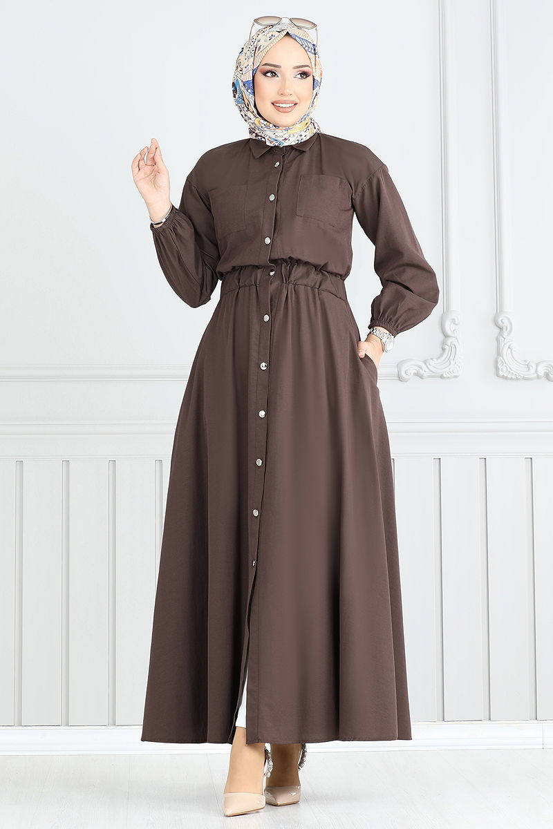 This stylish and functional Elastic Waist Dress is essential for your modest wear collection. Suitable for all seasons, it can be washed easily at 30 degrees using a gentle cycle. Made from terrycotton fabric, it offers both comfort and elegance, maintaining its shape over time. The shirt collar and front button design merge classic and contemporary styles. Its elastic waist and cuffs provide all-day comfort, while practical side pockets enhance functionality. The measurements of the model shown size 1 are: Height: 165 cm, Chest: 80 cm, Waist: 68 cm, Hips: 96 cm.