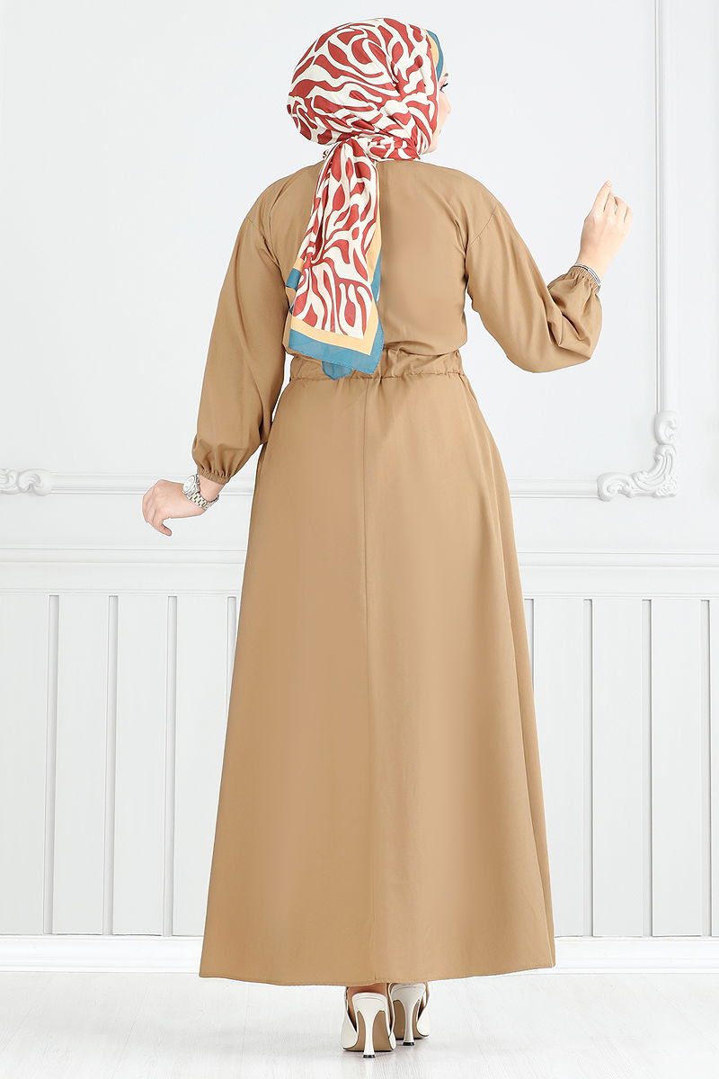 This stylish and functional Elastic Waist Dress is essential for your modest wear collection. Suitable for all seasons, it can be washed easily at 30 degrees using a gentle cycle. Made from terrycotton fabric, it offers both comfort and elegance, maintaining its shape over time. The shirt collar and front button design merge classic and contemporary styles. Its elastic waist and cuffs provide all-day comfort, while practical side pockets enhance functionality. The measurements of the model shown size 1 are: Height: 165 cm, Chest: 80 cm, Waist: 68 cm, Hips: 96 cm.
