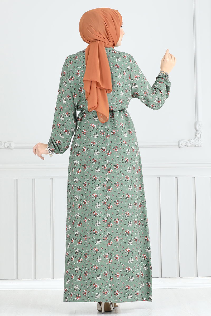 This floral-patterned modest dress catches the eye with its elegant design and can be comfortably worn in all seasons. Requiring hand wash, this special design is made of viscose fabric and offers comfortable wear. The dress, featuring a zipper at the back and elastic cuffs, has a stand-up collar. It is light and practical due to its lining-free structure. The dress also comes with a belt that matches the outfit; the belt is designed with sewn ends while the middle part is left unstitched for flexibility. The belt can be used optionally or removed. The product displayed on the model is size 1, and the model's measurements are as follows: Height: 165 cm, Chest: 80 cm, Waist: 68 cm, Hips: 96 cm, Weight: 54 kg.