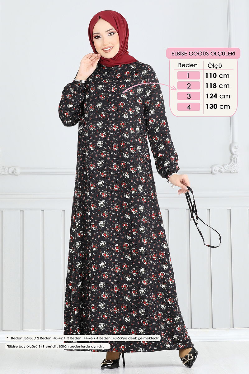 This floral-patterned modest dress catches the eye with its elegant design and can be comfortably worn in all seasons. Requiring hand wash, this special design is made of viscose fabric and offers comfortable wear. The dress, featuring a zipper at the back and elastic cuffs, has a stand-up collar. It is light and practical due to its lining-free structure. The dress also comes with a belt that matches the outfit; the belt is designed with sewn ends while the middle part is left unstitched for flexibility. The belt can be used optionally or removed. The product displayed on the model is size 1, and the model's measurements are as follows: Height: 165 cm, Chest: 80 cm, Waist: 68 cm, Hips: 96 cm, Weight: 54 kg.