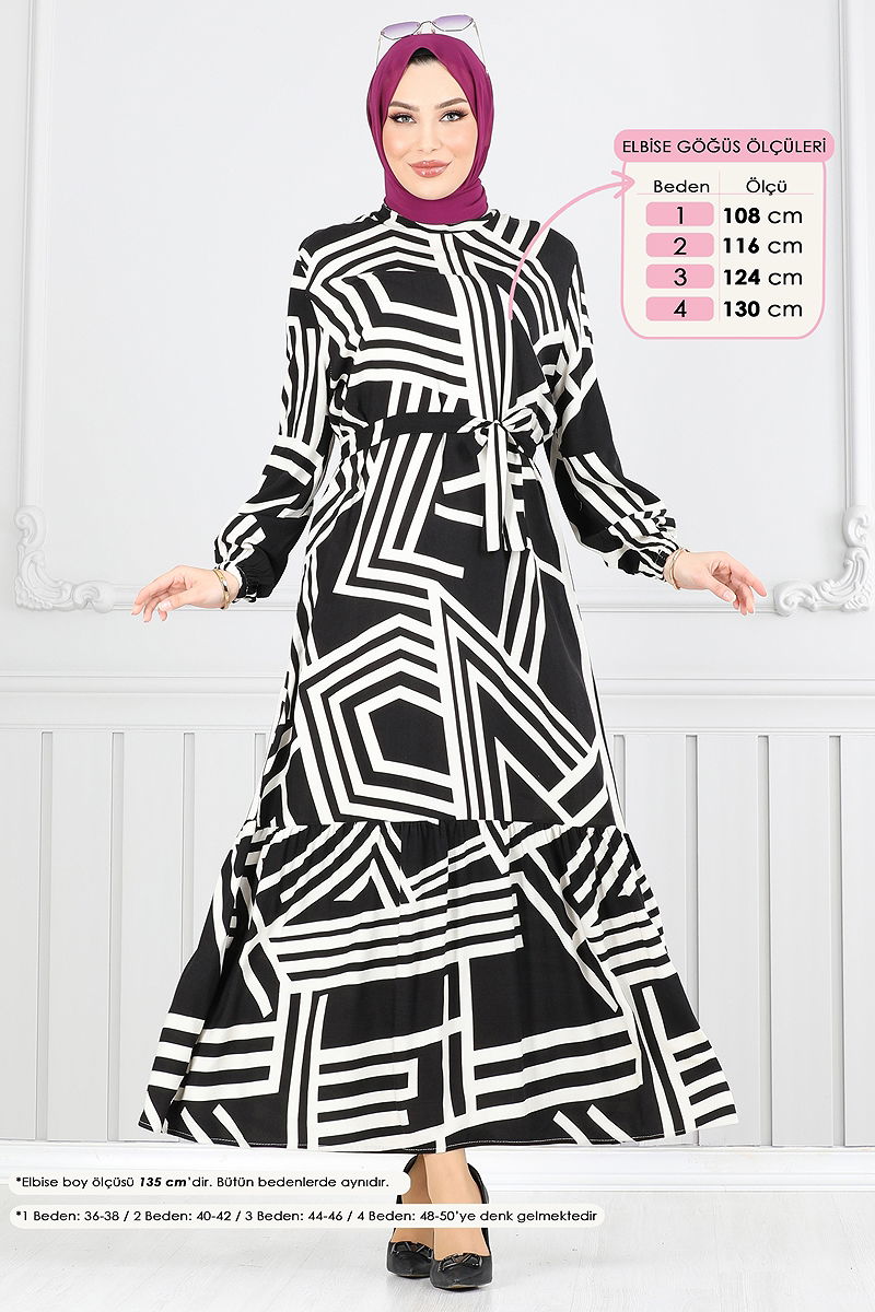 This stylish geometric patterned viscose dress can comfortably be worn all year round. It is recommended to be hand washed. Featuring a half mandarin collar and a lining-free design, it offers a modern look. The back zipper detail allows for practical use. The belt, designed to prevent waviness, is specially sewn and can be optionally removed. The elasticated cuffs make this a modest fashion product that combines elegance with comfort.