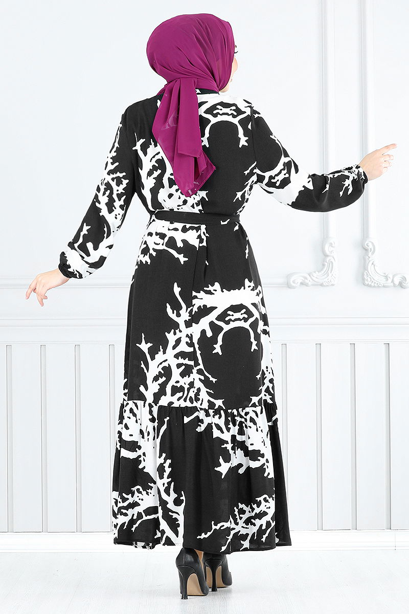 Elegant and functional, the Belted Patterned Viscose Dress is a modest wear item that can be comfortably worn in all seasons. Made of viscose fabric, this dress should be hand washed. It features a semi-mandarin collar design, is unlined and has a back zipper, making it both practical and stylish. The belt included with the dress is stitched at both ends to prevent waviness, with the middle left unstitched. The belt can be optionally removed. Elastic cuffs ensure a comfortable fit. The product displayed is in size 1.