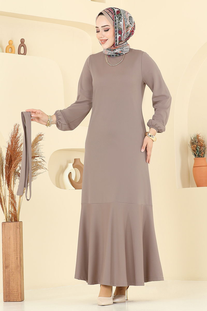 The Tiered Skirt Mira Dress is a modern modest wear piece that can be comfortably worn across all seasons. Recommended to be washed at 30 degrees on a gentle cycle, this dress is made from durable Mira fabric. Featuring a crew neck and a liner-free design, it offers comfort, while the standard elastic cuffs provide convenience. The dress includes a specially designed belt with stitched ends and an unstitched middle, enhancing its elegance while being optionally removable. Its classic and stylish look stands out in any setting.