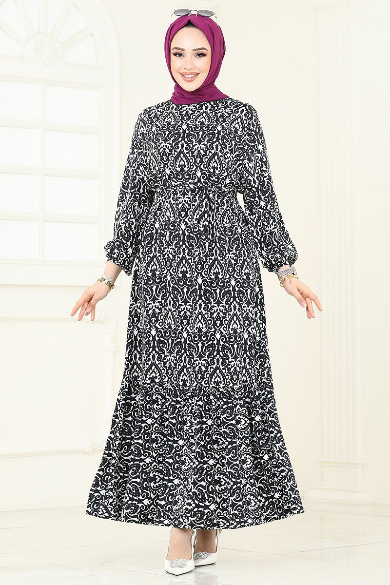The stylish and contemporary Patterned Viscose Hijab Dress can be comfortably worn in all four seasons. Made from breathable viscose fabric, it offers comfort all day long. Hand washing is recommended. It features a half Mandarin collar and a back zipper for practical use. Its lining-free design makes it lightweight and comfortable. The included belt can be optionally used, and its cuffs are elasticated. This dress is perfect for both everyday wear and special occasions.