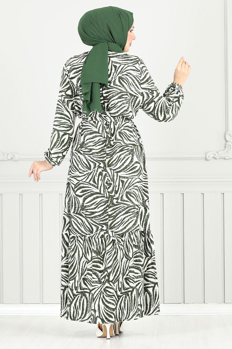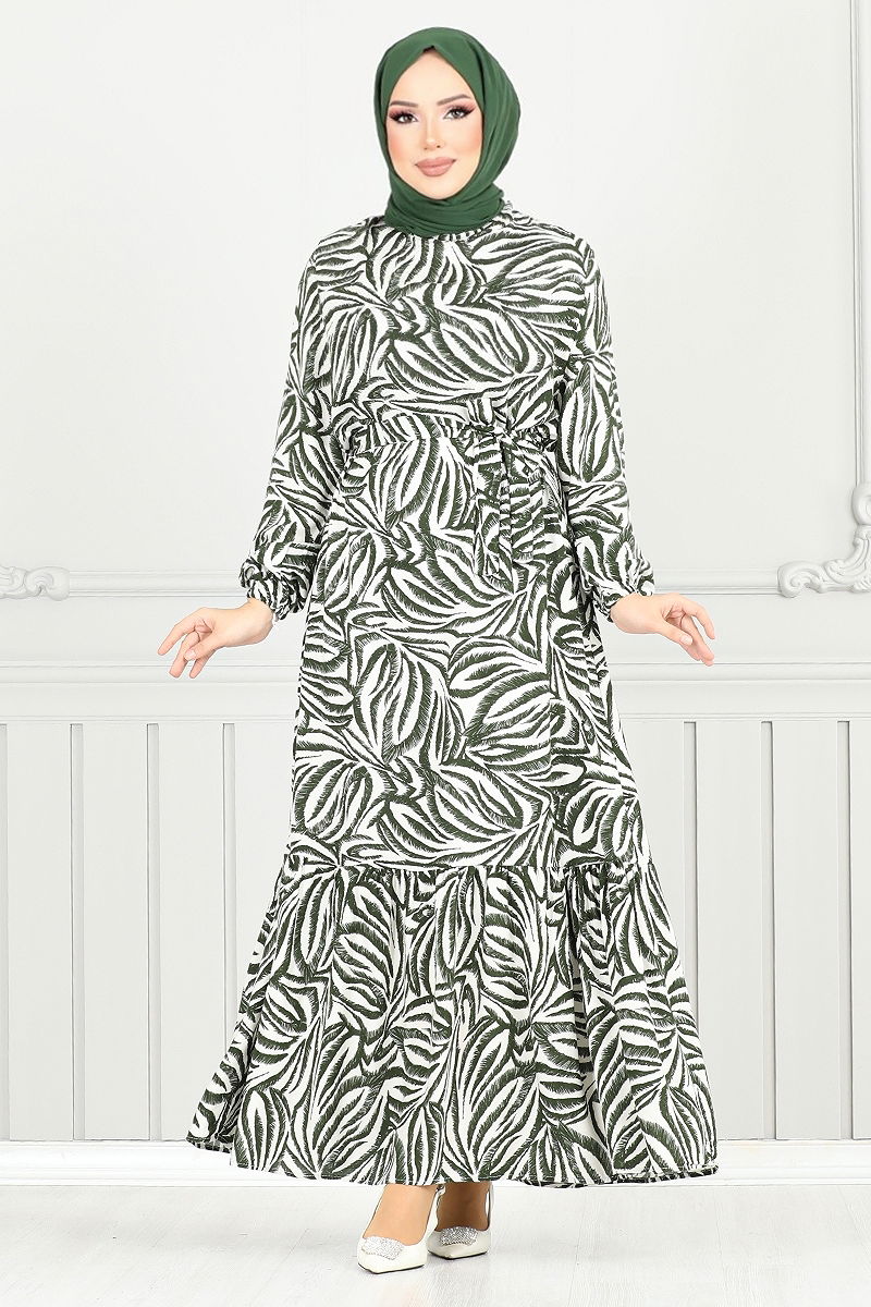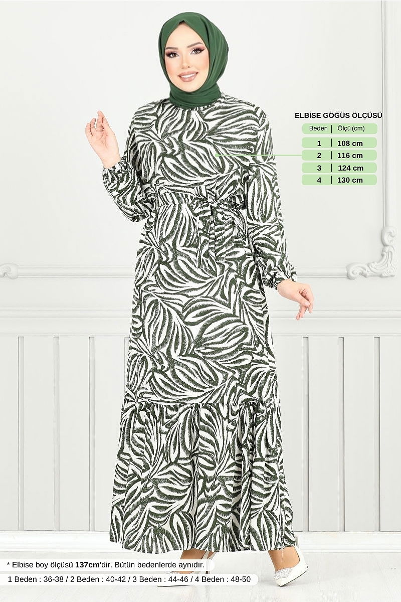 The Patterned Viscose Dress offers both style and comfort. Suitable for all-season wear, this modest dress is made from viscose and should be hand washed. It features a half-mandarin collar and a zipper at the back. The model is unlined, with elastic cuffs. The included belt, which can be optionally removed, adds a touch of elegance. The product displayed is size 1.