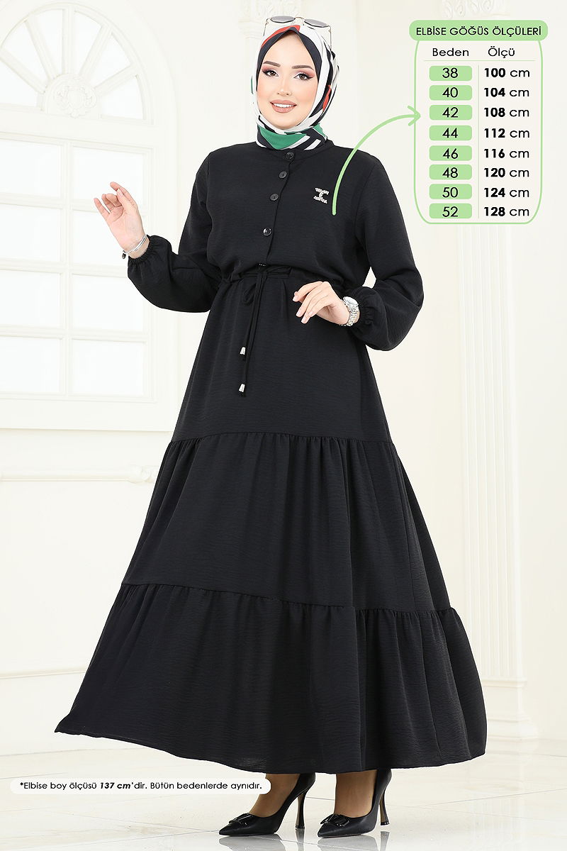 The Half-Buttoned Aerobin Dress is an ideal choice for comfort in all seasons. Made from the delicate Aerobin fabric, it is lightweight and comfortable. This dress, meticulously designed for those who prefer modest clothing, offers long-lasting use with its 30-degree delicate wash feature. It boasts a semi-mandarin collar and half-buttons at the front for a modern and stylish look. The dress is unlined and has elasticated cuffs. It features a tie at the waist, ensuring a comfortable fit for various body types. The dimensions of the dress are 165 cm height, 80 cm chest, 68 cm waist, 96 cm hips, and does not include accessories.