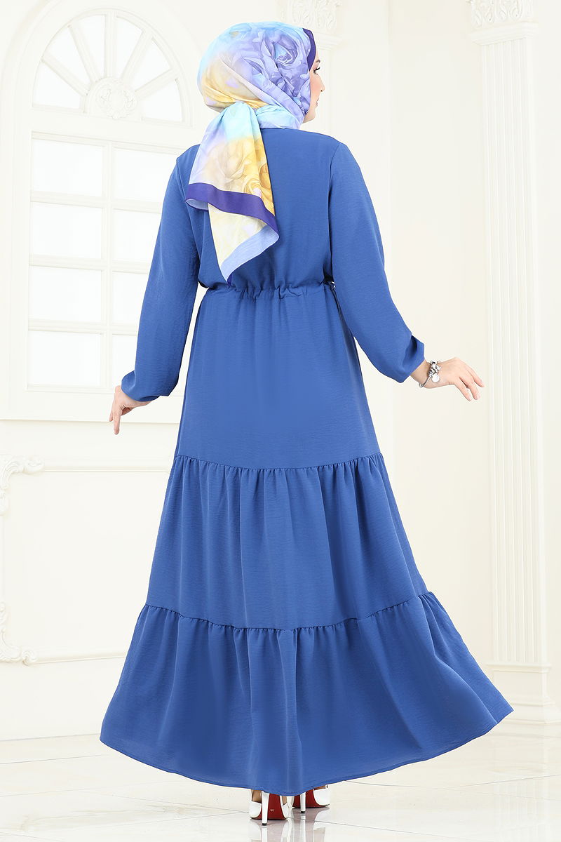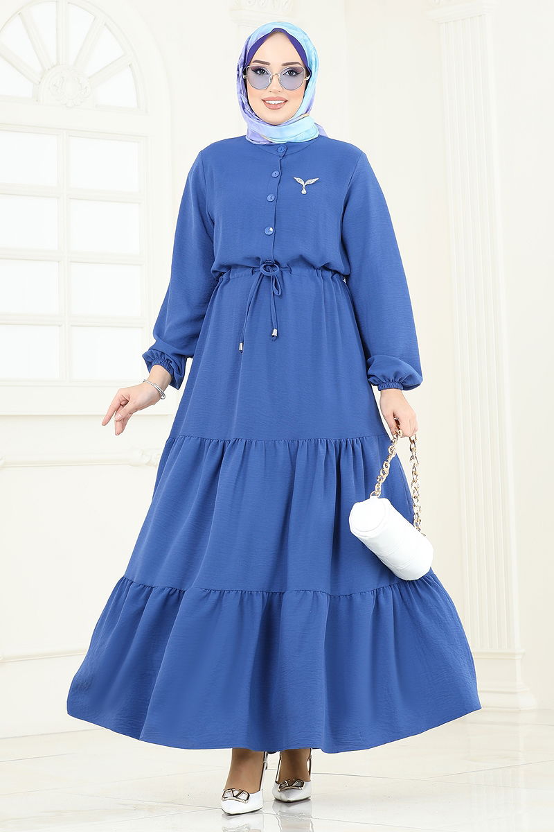 The Half-Buttoned Aerobin Dress is an ideal choice for comfort in all seasons. Made from the delicate Aerobin fabric, it is lightweight and comfortable. This dress, meticulously designed for those who prefer modest clothing, offers long-lasting use with its 30-degree delicate wash feature. It boasts a semi-mandarin collar and half-buttons at the front for a modern and stylish look. The dress is unlined and has elasticated cuffs. It features a tie at the waist, ensuring a comfortable fit for various body types. The dimensions of the dress are 165 cm height, 80 cm chest, 68 cm waist, 96 cm hips, and does not include accessories.