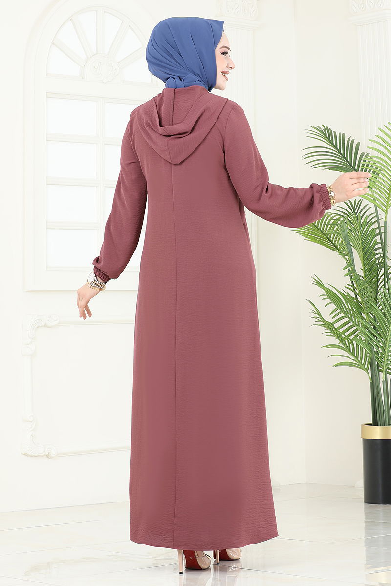 The Half-Snap Aerobin Dress is a modest wear model made from aerobin fabric, featuring a hooded neckline without lining. Offered in size 38, this stylish dress has front-usable snaps and can be comfortably worn in all seasons. The product promises long-lasting wear when cared for properly: wash on a gentle cycle at 30 degrees Celsius. The hood is permanently attached, and the elastic cuffs ensure comfort throughout the day.