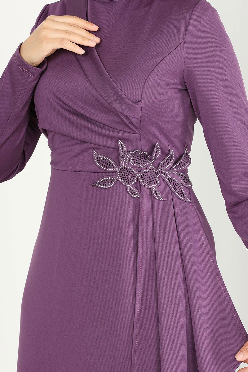 Draped Pencil Dress is a model of modest clothing suitable for all seasons. It should only be dry cleaned. It is made of high-quality Crepe fabric. The dress features a bicycle collar design and does not have a lining. It has a back zipper. (The product on the model is size 38.) Height: 160cm, Bust: 86cm, Waist: 68cm, Hips: 95cm, Weight: 52kg. The stones are adhesive.