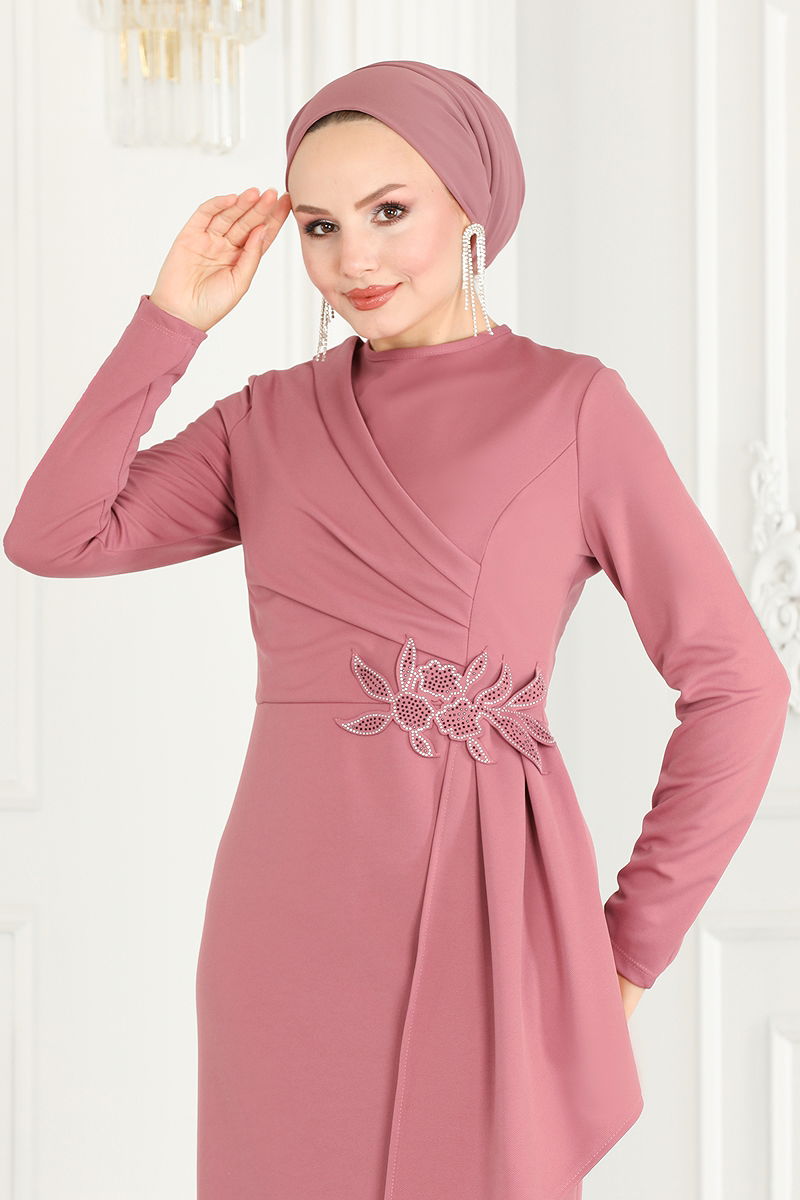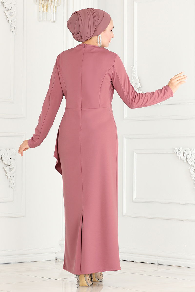 Draped Pencil Dress is a model of modest clothing suitable for all seasons. It should only be dry cleaned. It is made of high-quality Crepe fabric. The dress features a bicycle collar design and does not have a lining. It has a back zipper. (The product on the model is size 38.) Height: 160cm, Bust: 86cm, Waist: 68cm, Hips: 95cm, Weight: 52kg. The stones are adhesive.