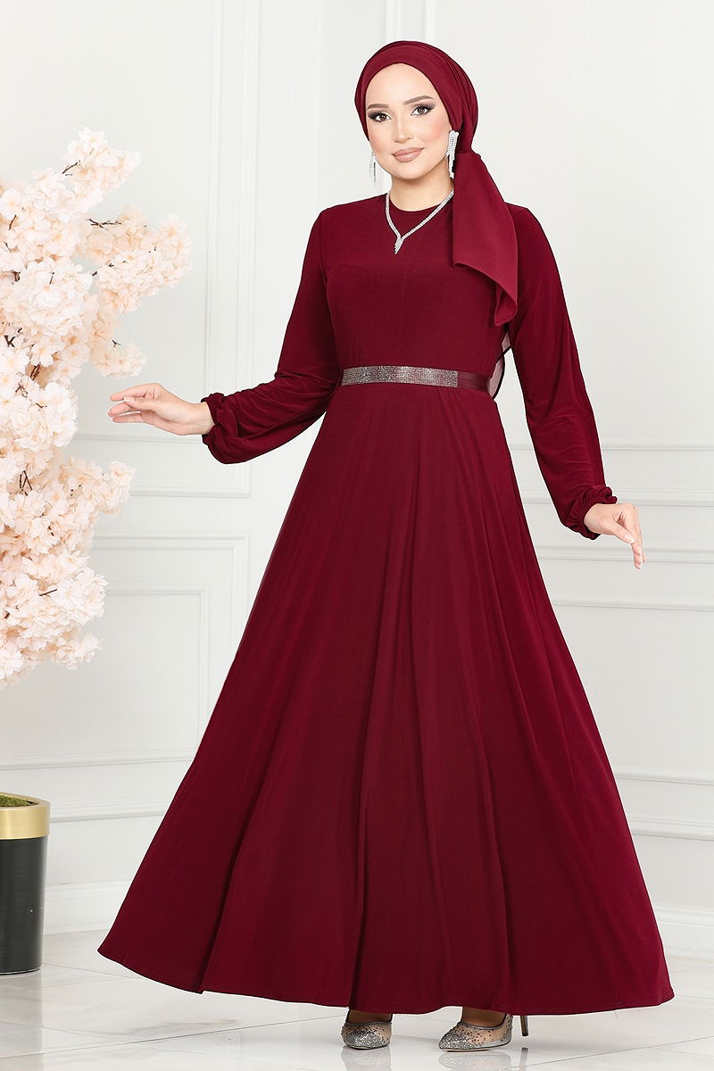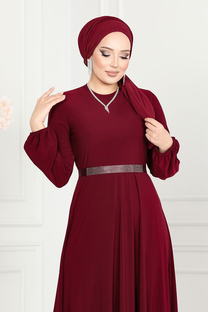 Sandy Stone Belt Dress is a hijab dress model. It can be used in all seasons. For printed products, the item should be washed inside out and ironed from the reverse side. It is Sandy fabric. The product has a bicycle collar and is unlined. (The product on the model is size 38.) The inner dress is worn over the head. The stones are attached. The edges of the belt are stitched to prevent flapping, leaving the middle part empty (seamless). The belt is included with the product and can be optionally used. The cuffs are elastic.