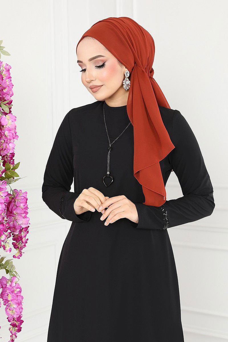Kolyeli Krep Dress DRESS model is a hijab product. It can be used in Four Season seasons. It should be washed at 30 degrees without squeezing. It is made of first class Krep fabric. The product has a Bicycle collar. The product is buttoned from the back. It is unlined. (The product on the model is size 38.) The necklace is included with the product and may be optionally used.