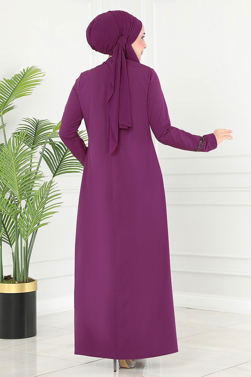 Kolyeli Krep Dress DRESS model is a hijab product. It can be used in Four Season seasons. It should be washed at 30 degrees without squeezing. It is made of first class Krep fabric. The product has a Bicycle collar. The product is buttoned from the back. It is unlined. (The product on the model is size 38.) The necklace is included with the product and may be optionally used.
