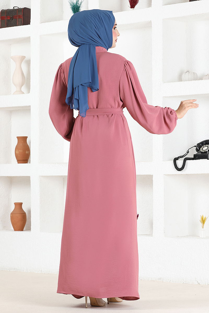 Shirt Collar Buttoned Dress is a dress model suitable for hijab. It can be used in spring and summer seasons. It is made of first-class Aerobin fabric. The product has a shirt collar and is buttoned from the front. It is unlined. (The product on the model is size 38) The two ends of the belt are sewn to prevent fluttering, and the middle part is left empty (seamless). The belt is included with the product and can be optionally used. The cuffs are elastic.