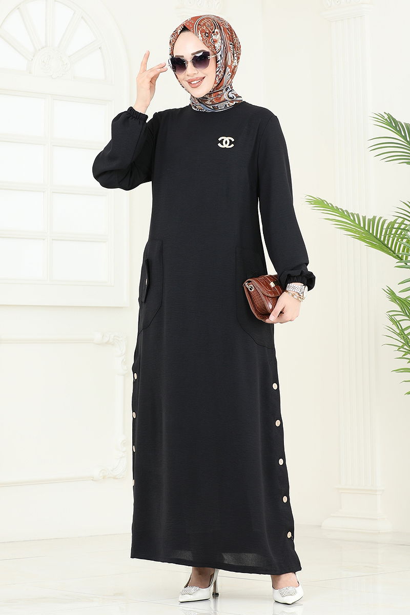 The Slit Buttoned Modest Dress is a stylish and functional design that can be comfortably worn across all seasons. Made from aerobin fabric, this dress is machine washable at 30 degrees on a gentle cycle. It features active slit buttons, a bicycle neck detail, and a back button for increased functionality. The unlined design and elasticated cuffs offer comfort, while its pocketed structure provides practical utility. Measurements of the model: Height: 165 cm, Chest: 88 cm, Waist: 68 cm, Hips: 99 cm, Weight: 56 kg (size 40).