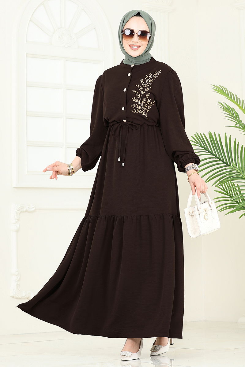 The Embroidered Dress is an ideal choice for women who prefer modest clothing. Suitable for all seasons, this dress can be washed at 30 degrees on a delicate cycle. Made from Aerobin fabric, it is lightweight and breathable. The half-stand collar and half-button details on the front provide a chic look. It offers comfortable wear with a lining-free design, elastic and tie-up cuffs. The embroidered details add an eye-catching appearance. The model is size 38 with measurements: height 165 cm, chest 88 cm, waist 68 cm, hips 99 cm, and weight 56 kg.