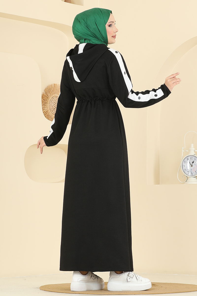 The Belt Tunnel Detailed Dress is a modest wear suitable for all seasons. Made from special double-thread fabric, this dress offers both elegance and comfort. It can be cleaned with a gentle wash at 30 degrees. This model features a hoodie and is designed without lining, providing a contemporary look. The drawstring waist and patch details make this dress stand out in any setting. The product on the model is size 38.