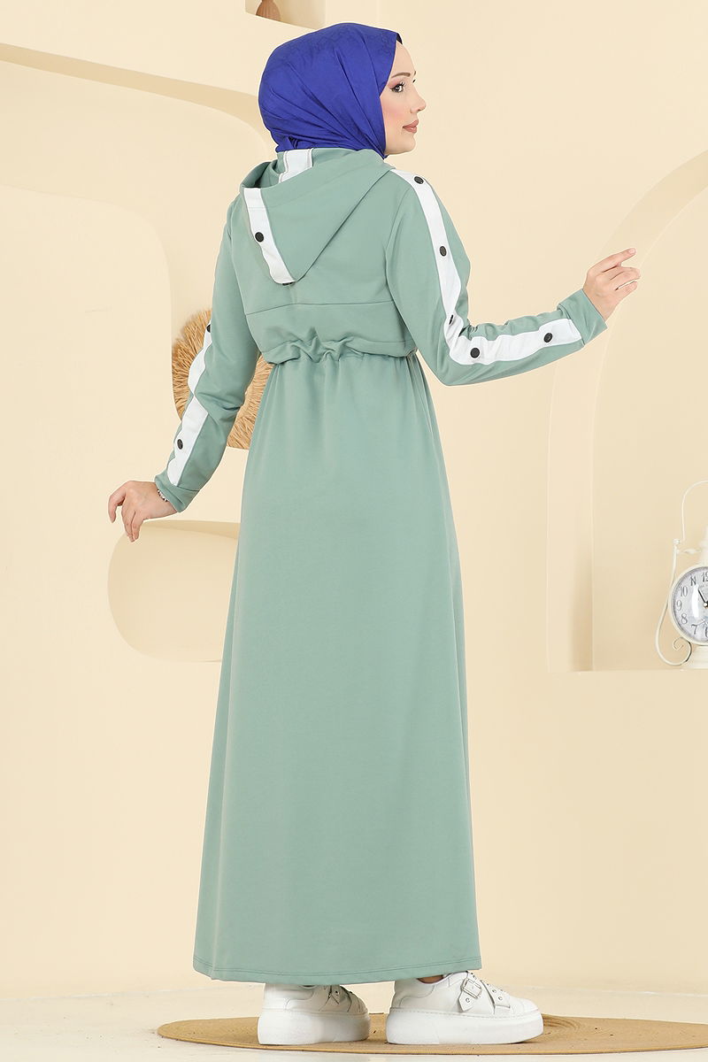 The Belt Tunnel Detailed Dress is a modest wear suitable for all seasons. Made from special double-thread fabric, this dress offers both elegance and comfort. It can be cleaned with a gentle wash at 30 degrees. This model features a hoodie and is designed without lining, providing a contemporary look. The drawstring waist and patch details make this dress stand out in any setting. The product on the model is size 38.