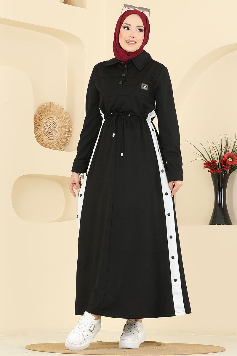 The Half-Buttoned Front Dress is designed for modest wear, suitable for all seasons. Crafted from durable double-thread fabric, this stylish piece features a shirt collar and half-button front closure, ensuring coverage as it is unlined. Displayed in a size 38 sample, it includes an adjustable drawstring waist, offering customizable comfort.