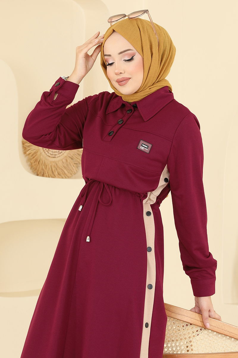 The Half-Buttoned Front Dress is designed for modest wear, suitable for all seasons. Crafted from durable double-thread fabric, this stylish piece features a shirt collar and half-button front closure, ensuring coverage as it is unlined. Displayed in a size 38 sample, it includes an adjustable drawstring waist, offering customizable comfort.