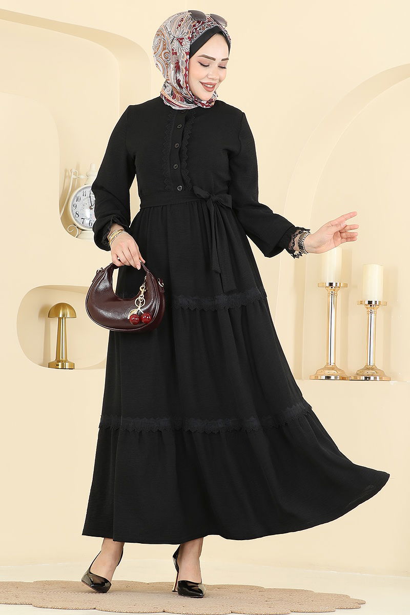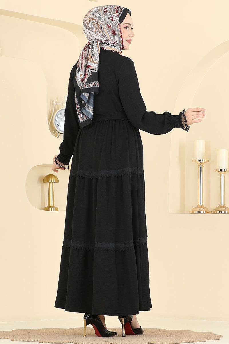 The Lace-Detailed Belted Dress brings a fresh breath to modest fashion, combining ease and elegance. Suitable for all seasons, this dress is made from special aerobin fabric, ensuring comfort. It can be washed at 30 degrees on a delicate cycle. The semi-mandarin collar design and half-button details on the front accentuate its style, while the lace details enhance its femininity. The included belt, which can be optionally omitted, is adaptable to various styles. This elegant piece, with its elasticated cuffs and lacking any belt loops, blends classic and modern elements seamlessly.