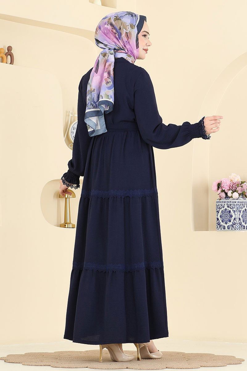 The Lace-Detailed Belted Dress brings a fresh breath to modest fashion, combining ease and elegance. Suitable for all seasons, this dress is made from special aerobin fabric, ensuring comfort. It can be washed at 30 degrees on a delicate cycle. The semi-mandarin collar design and half-button details on the front accentuate its style, while the lace details enhance its femininity. The included belt, which can be optionally omitted, is adaptable to various styles. This elegant piece, with its elasticated cuffs and lacking any belt loops, blends classic and modern elements seamlessly.