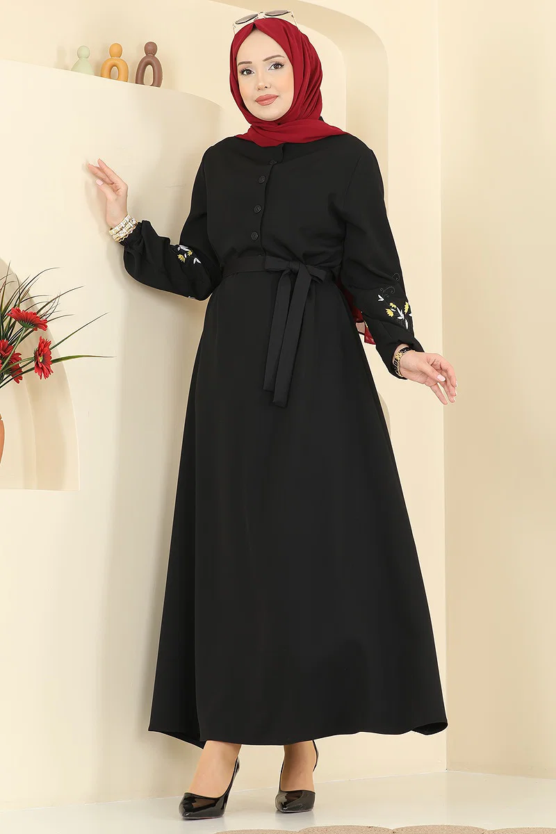 The Embroidered Button-Front Dress features a modest design suitable for all seasons. It can be washed delicately at 30 degrees Celsius, ensuring durability. Made from sturdy dabıl fabric, this dress offers a chic semi-high collar and a practical front-button closure. Its elastic cuffs add ease and comfort. The displayed model wears size 38, but various sizes are available to meet your needs.