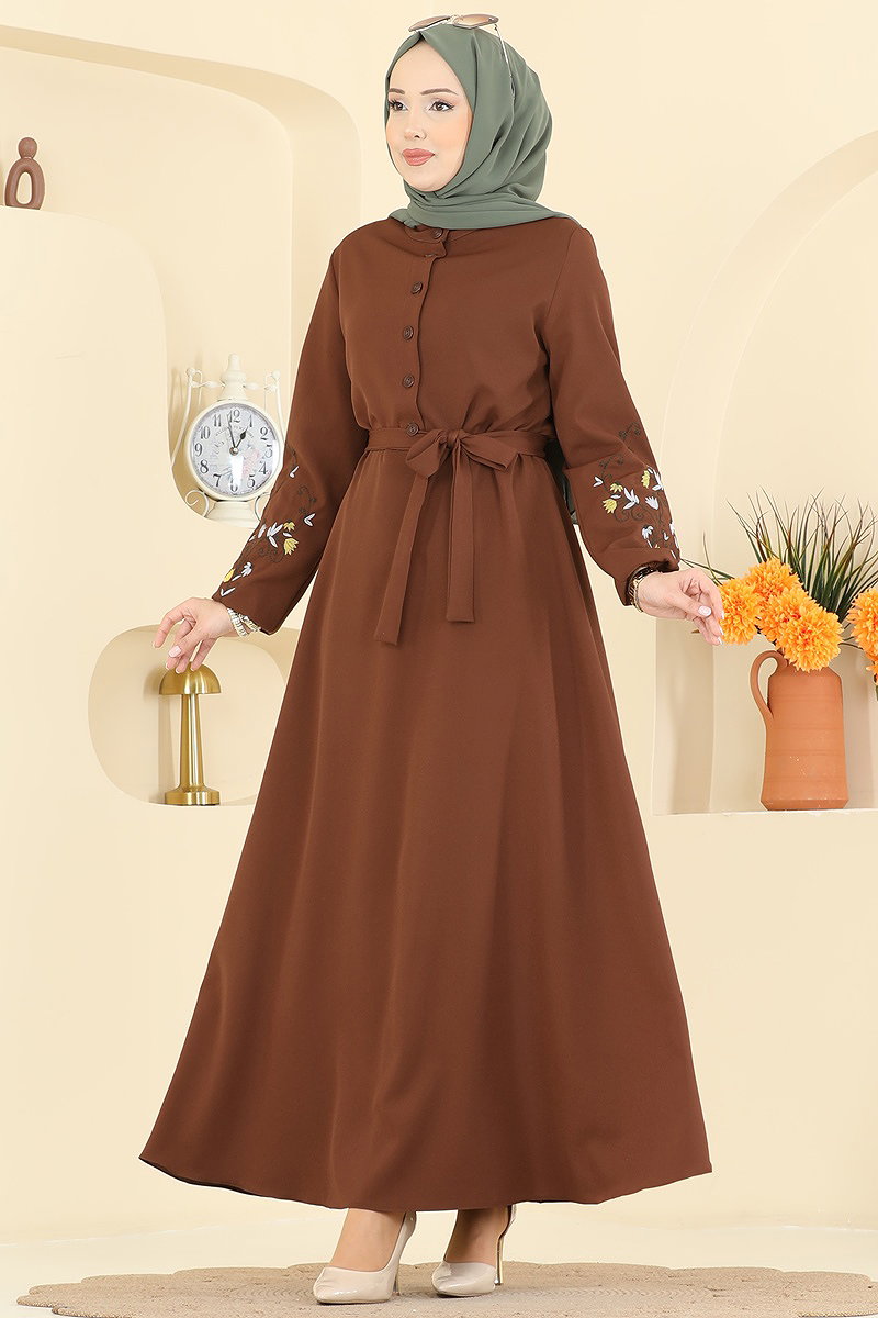 The Embroidered Button-Front Dress features a modest design suitable for all seasons. It can be washed delicately at 30 degrees Celsius, ensuring durability. Made from sturdy dabıl fabric, this dress offers a chic semi-high collar and a practical front-button closure. Its elastic cuffs add ease and comfort. The displayed model wears size 38, but various sizes are available to meet your needs.