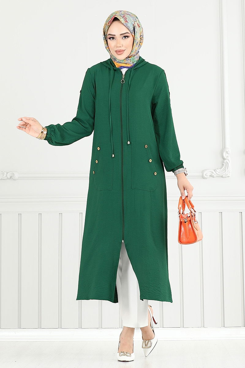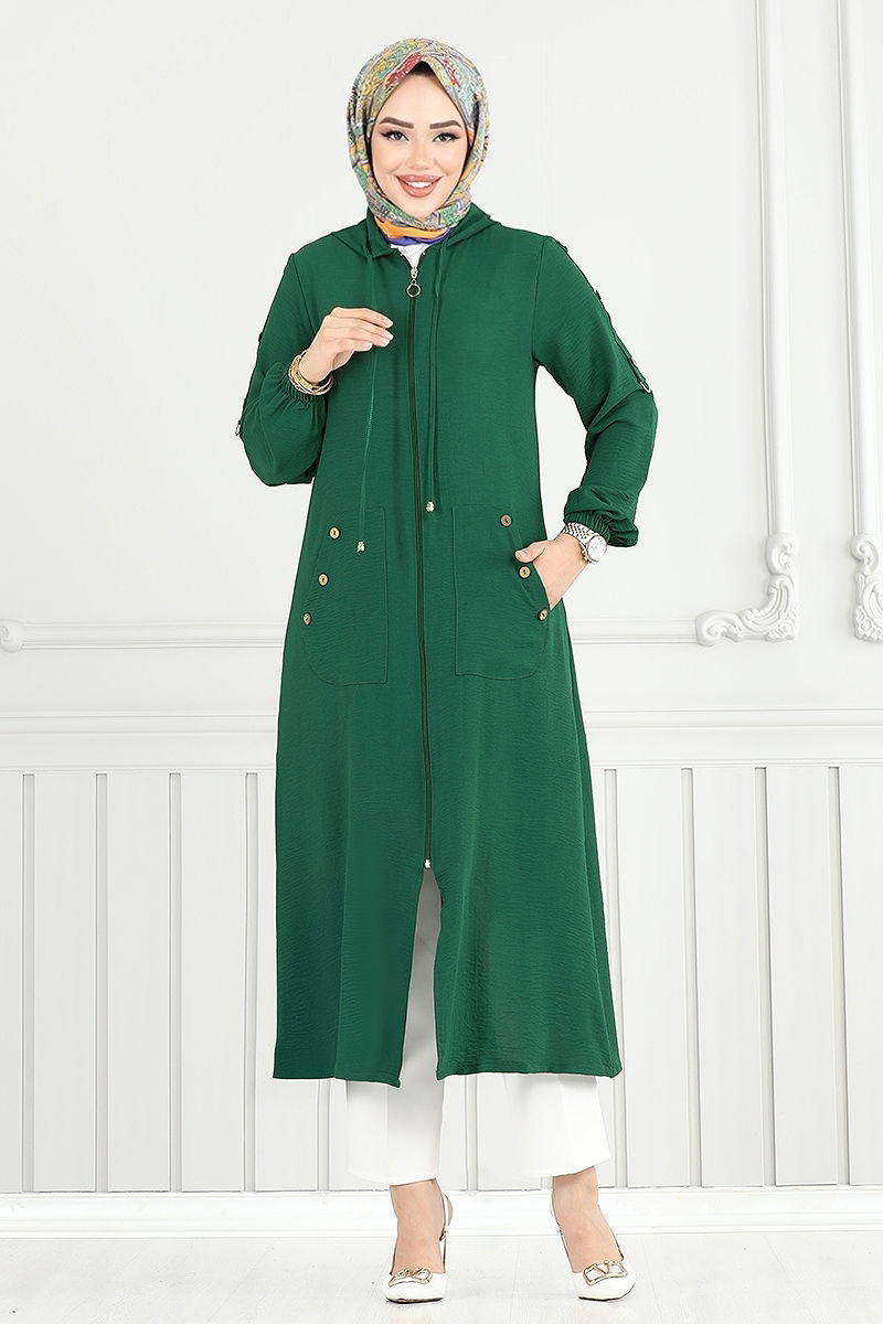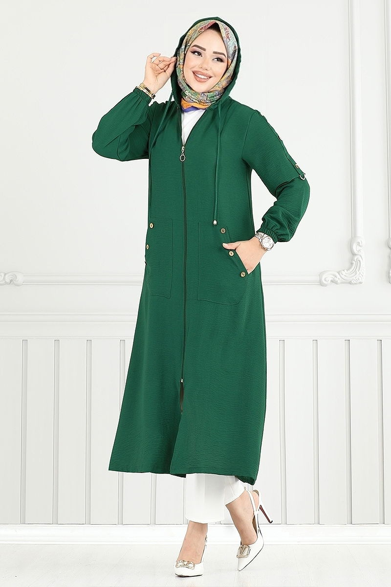 Ürün Özelliği : Yeni sezon tesettür moda ürünüdür. Ürün Kapşonlu yakadır. Astarsızdır. Ürün Önden fermuarlıdır. Kapşon ürüne dikilidir. Düğmeler aksesuardır. Cep mevcuttur. Manşet lastiklidir. Konsept fotoğraf çekimlerinden dolayı üründe ton farklılığı olabilir.