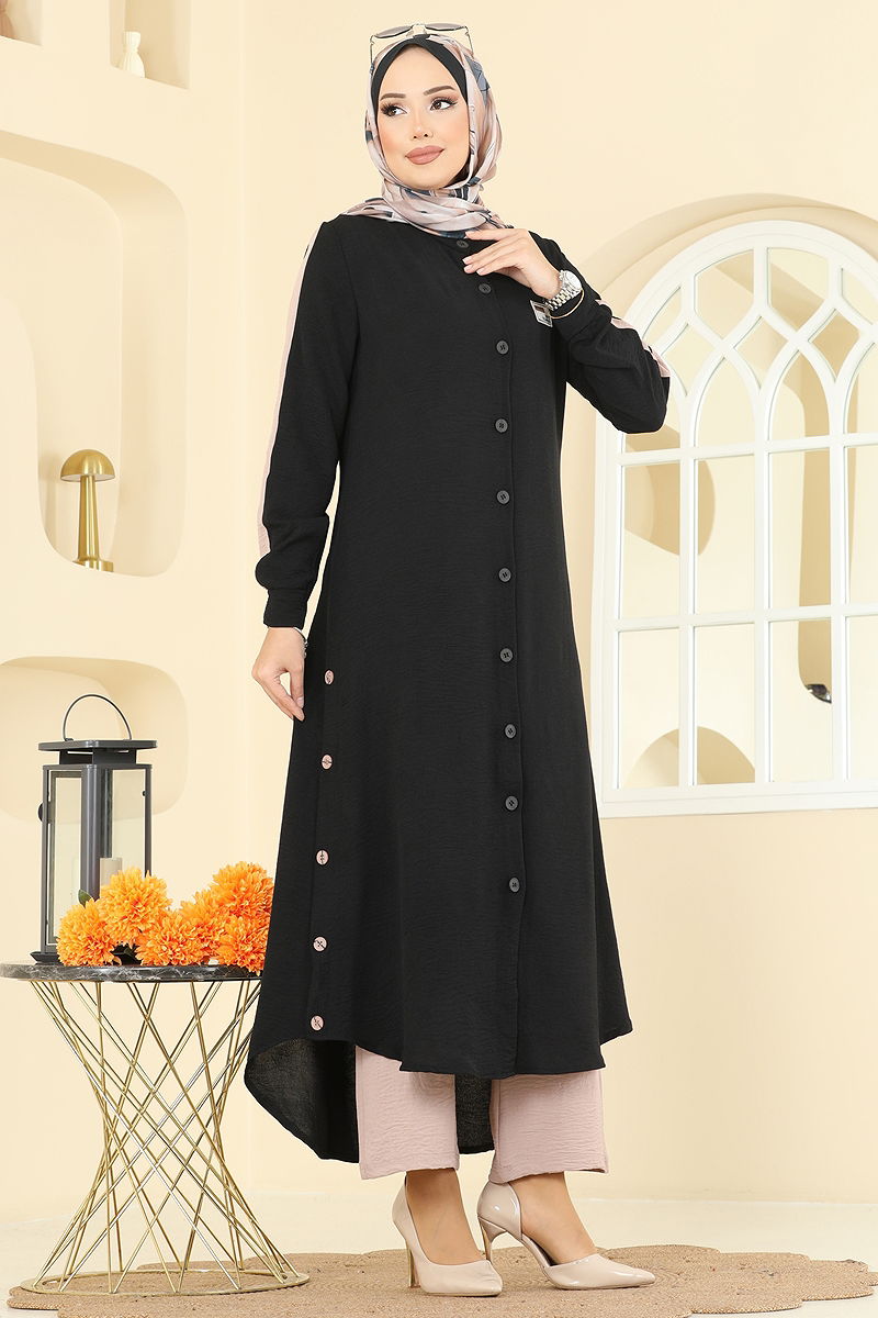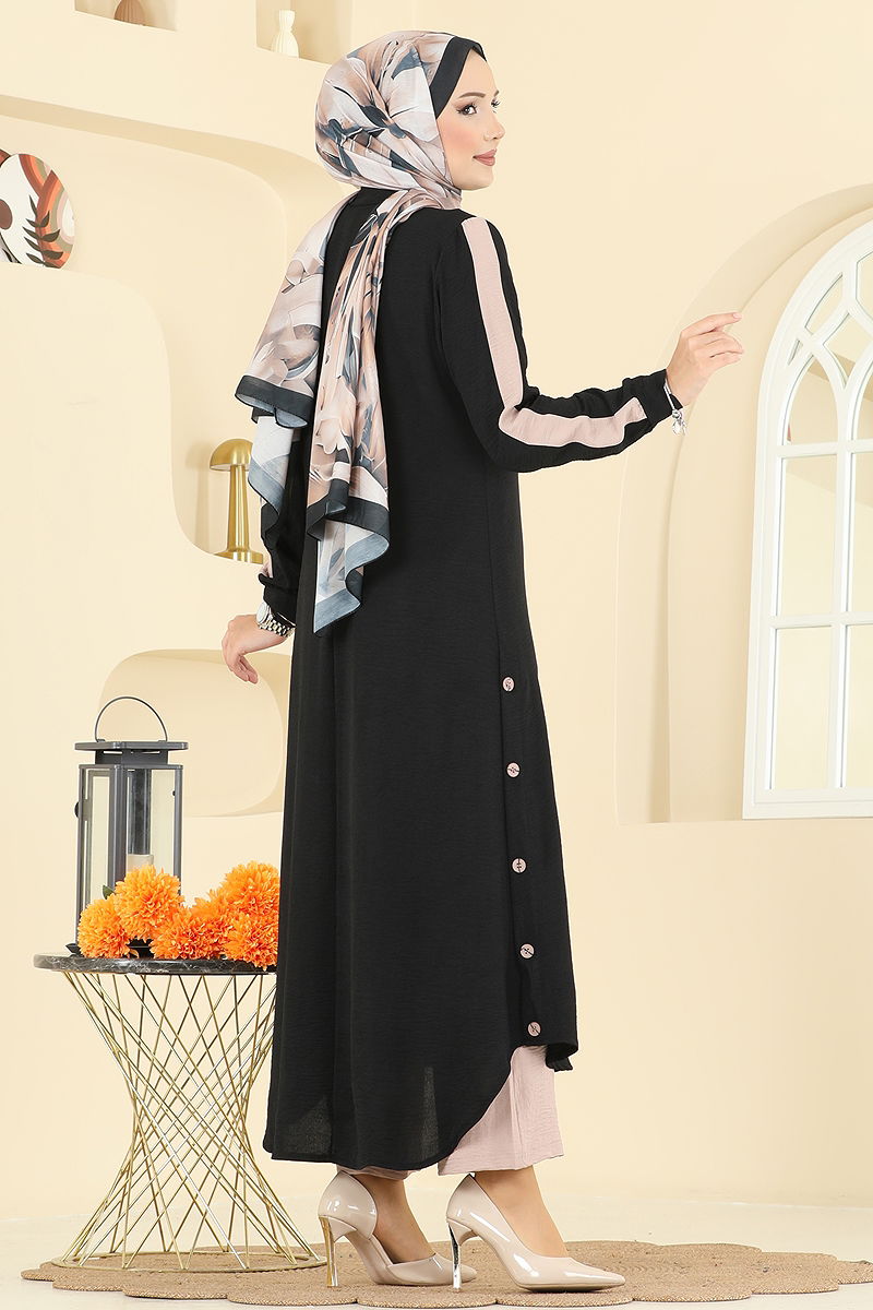 Şık ve zarif bir seçim olan Düğme Detaylı Aerobin Takım, her mevsim rahatlıkla kullanabileceğiniz tesettür bir kombindir. Aerobin kumaşın yumuşak dokusu ve nefes alabilen yapısı, gün boyu konfor sağlar. Yarım hakim yaka ve ön kısımdaki düğme detayları ile modern bir görünüm sunar. Pantolonun lastikli beli ise mükemmel bir uyum sağlayarak rahat hareket etmenize olanak tanır. Tunik ve pantolon şeklindeki parçalar, hem günlük hem de özel günlerinizde ideal bir tercihtir. Ürün hassas yıkama ile 30 derecede yıkanabilir ve kolaylıkla bakımı yapılabilir.