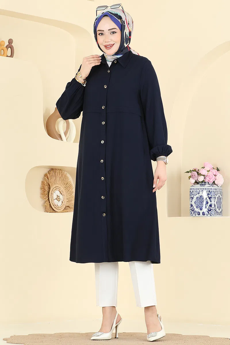 Şıklığınızı tamamlayacak Düğme Detaylı Belmando Tunik, her mevsim rahatlıkla kullanabileceğiniz tesettür giyim modelidir. Hassas kumaş yapısıyla 30 derecede yıkanabilen bu tunik, gömlek yaka ve ön düğme detaylarıyla modern bir duruş sergiler. Önden yırtmaçlı ve manşet lastikli tasarımı ile konforu ön planda tutar. Dinamik ve şık bir görünüm için idealdir.