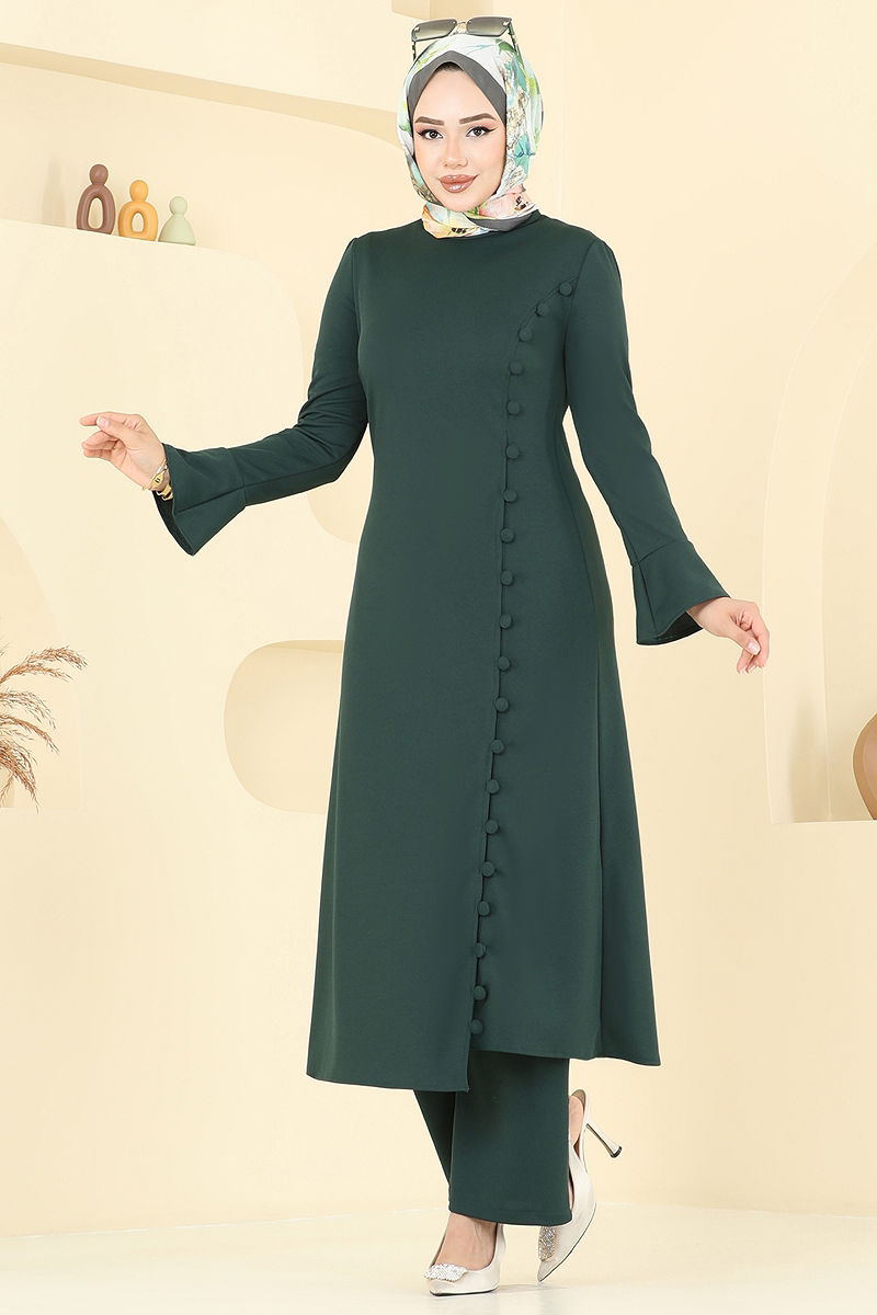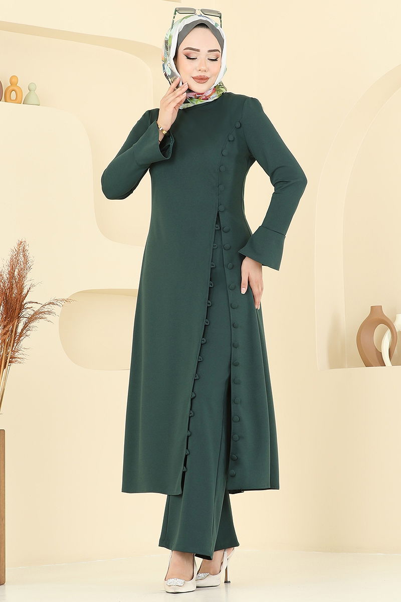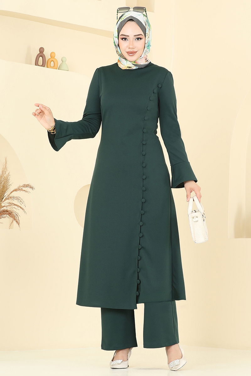 المنتج لديه ياقة دائرية. المنتج به أزرار نصف أمامي. الأزرار في الفتحات فعالة. غير مبطنة. المنتج به سحاب في جزء من الخلف. خصر البنطال مرن. قد يكون هناك اختلاف في الدرجة اللونية في المنتج بسبب التقاط الصور الفوتوغرافية.