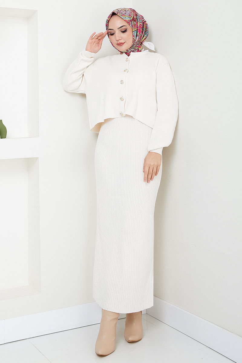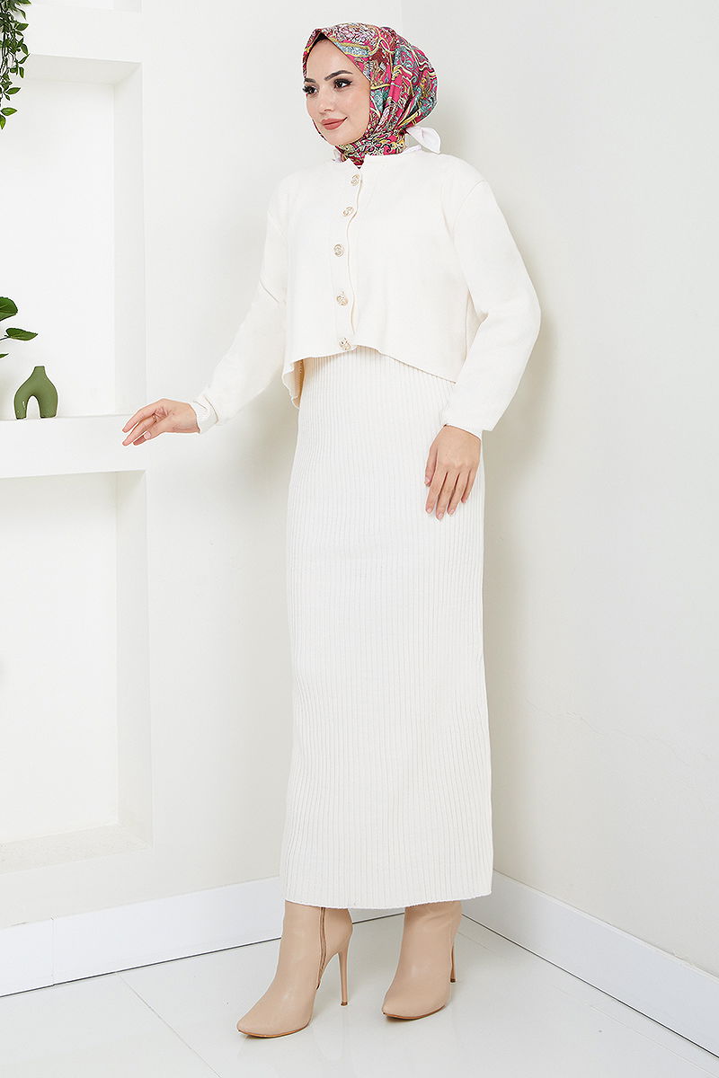 Düğme Detaylı Takım model tesettür ürünüdür. Sonbahar ve Kış sezonunda kullanılabilir. 30 derecede sıkma yapılmadan yıkanmalıdır. Birinci sınıf Triko kumaştan imal edilmiştir. Ürün Bisiklet yakadır. Ürün Önden düğmelidir. Astarsızdır. (Modelin üzerindeki ürün standart bedendir.)