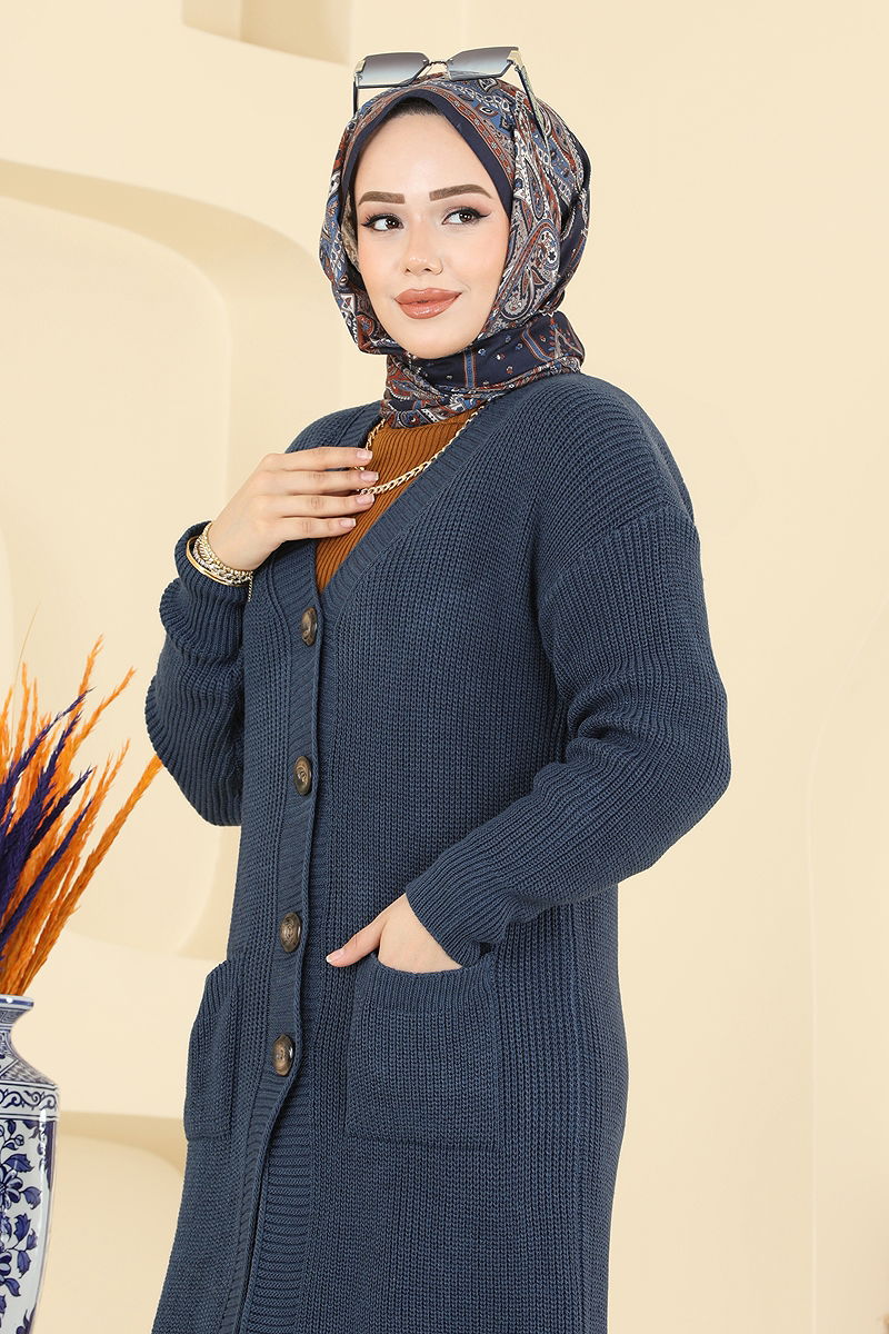 Düğme Detaylı Triko Hırka İndigo