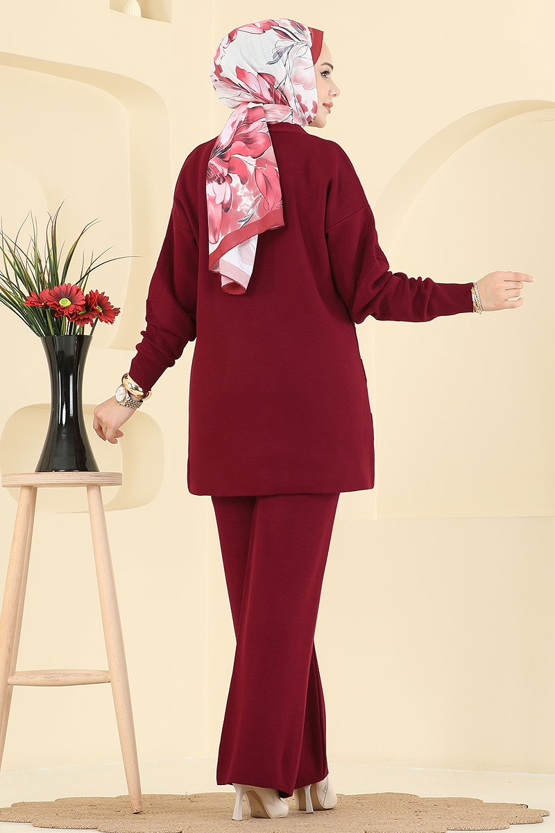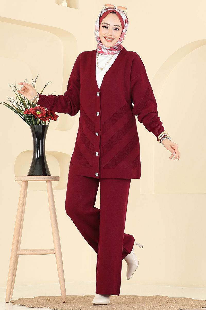 Düğme Detaylı Triko Takım Bordo
