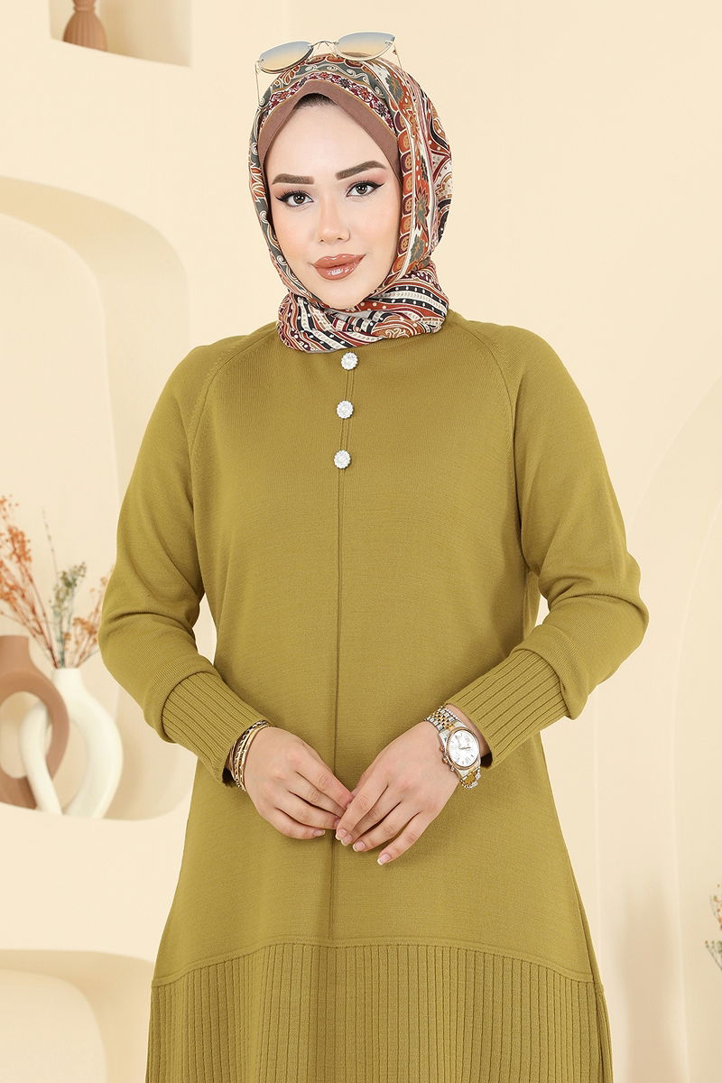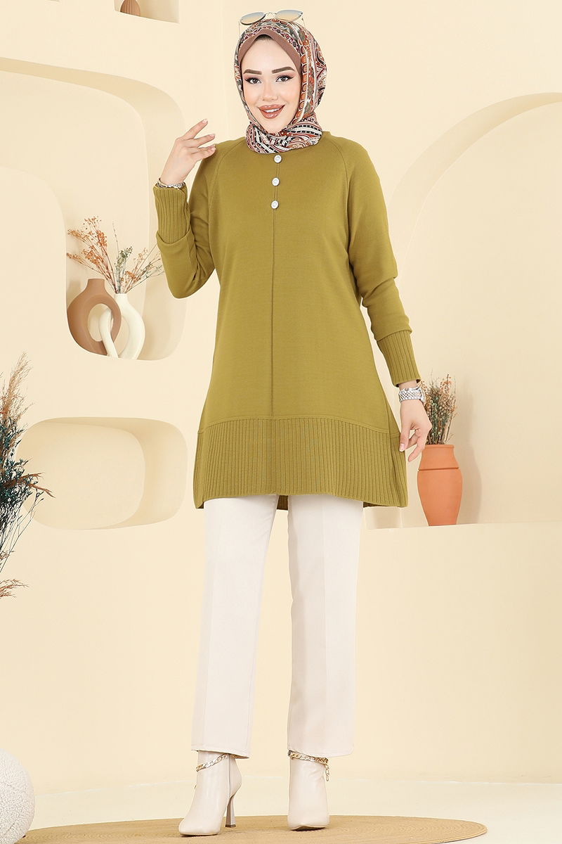 Düğme Detaylı Triko Tunik Yağ Yeşili