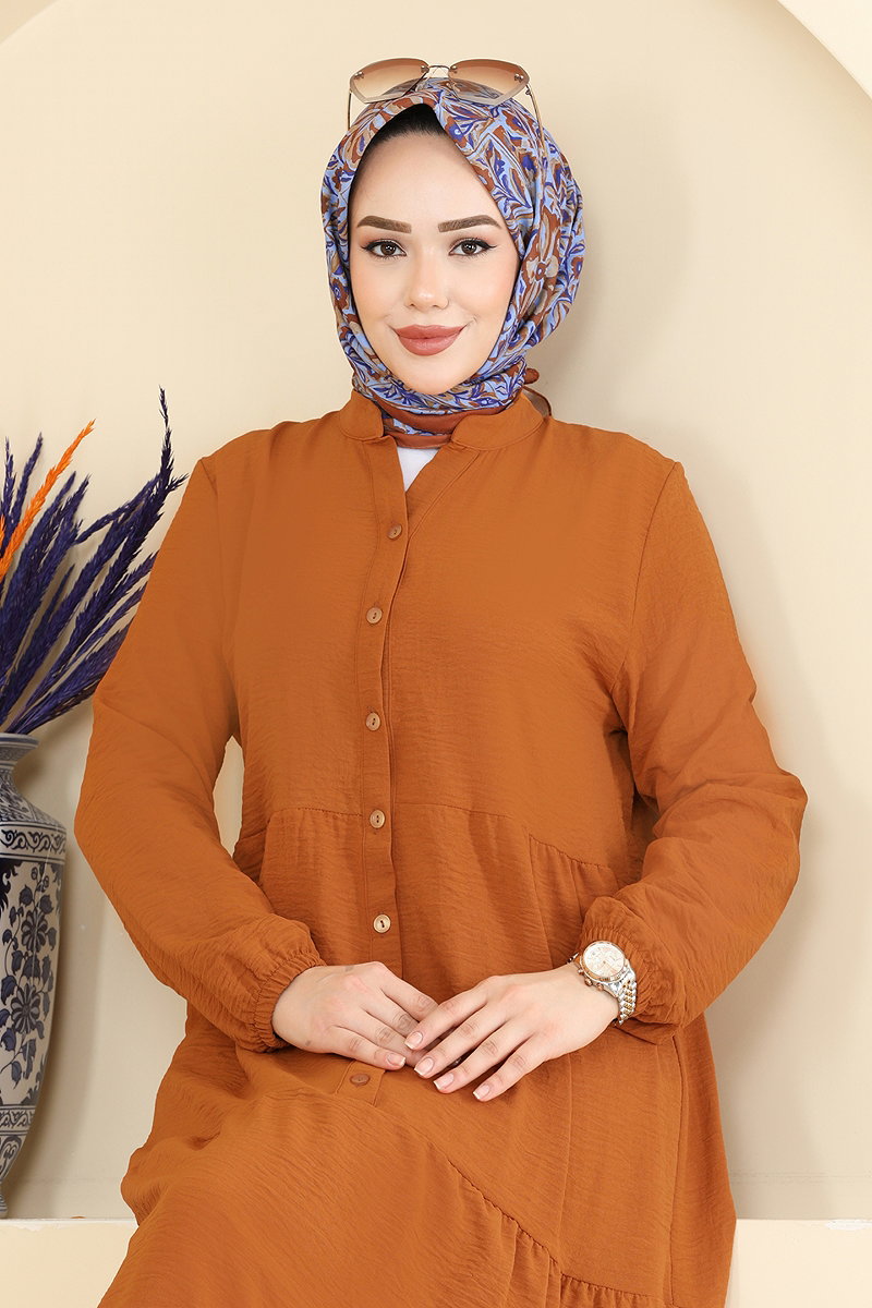 Düğmeli Aerobin Uzun Elbise 4124ZNNK1102 Hardal
