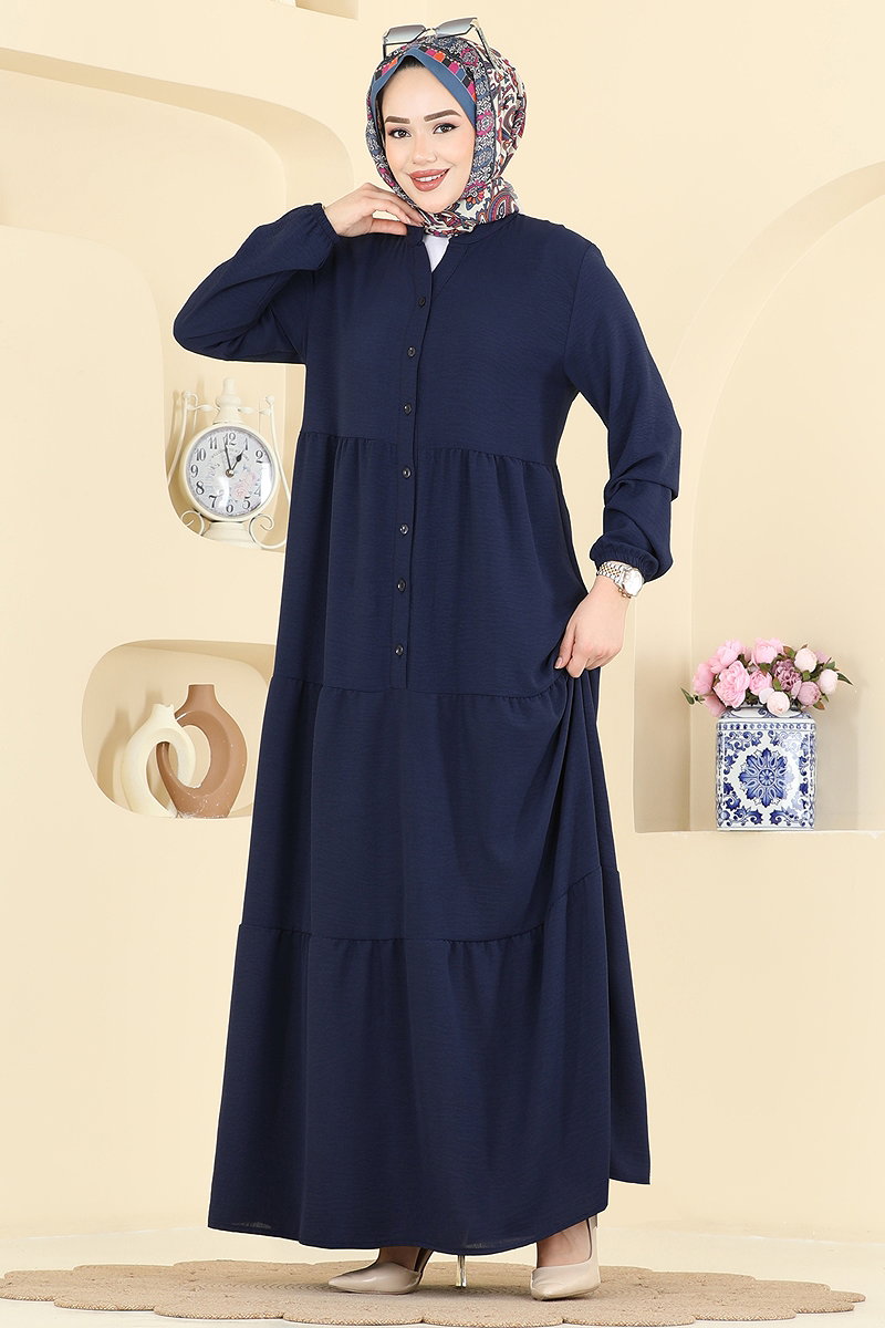 Düğmeli Aerobin Uzun Elbise, tesettür tasarımıyla modern ve şık. Dört mevsim rahatlıkla kullanabileceğiniz bu elbise, 30 derecede hassas yıkama programında yıkanabilir. Aerobin kumaşı sayesinde uzun süreli kullanım vaat eder. Yarım hakim yakası ve ön tarafı düğmeli dizaynıyla pratik bir kullanım sunar. Ürün astarsızdır ve manşetleri lastiklidir. Modellerimiz 40 beden üzerinde gösterilmiştir.