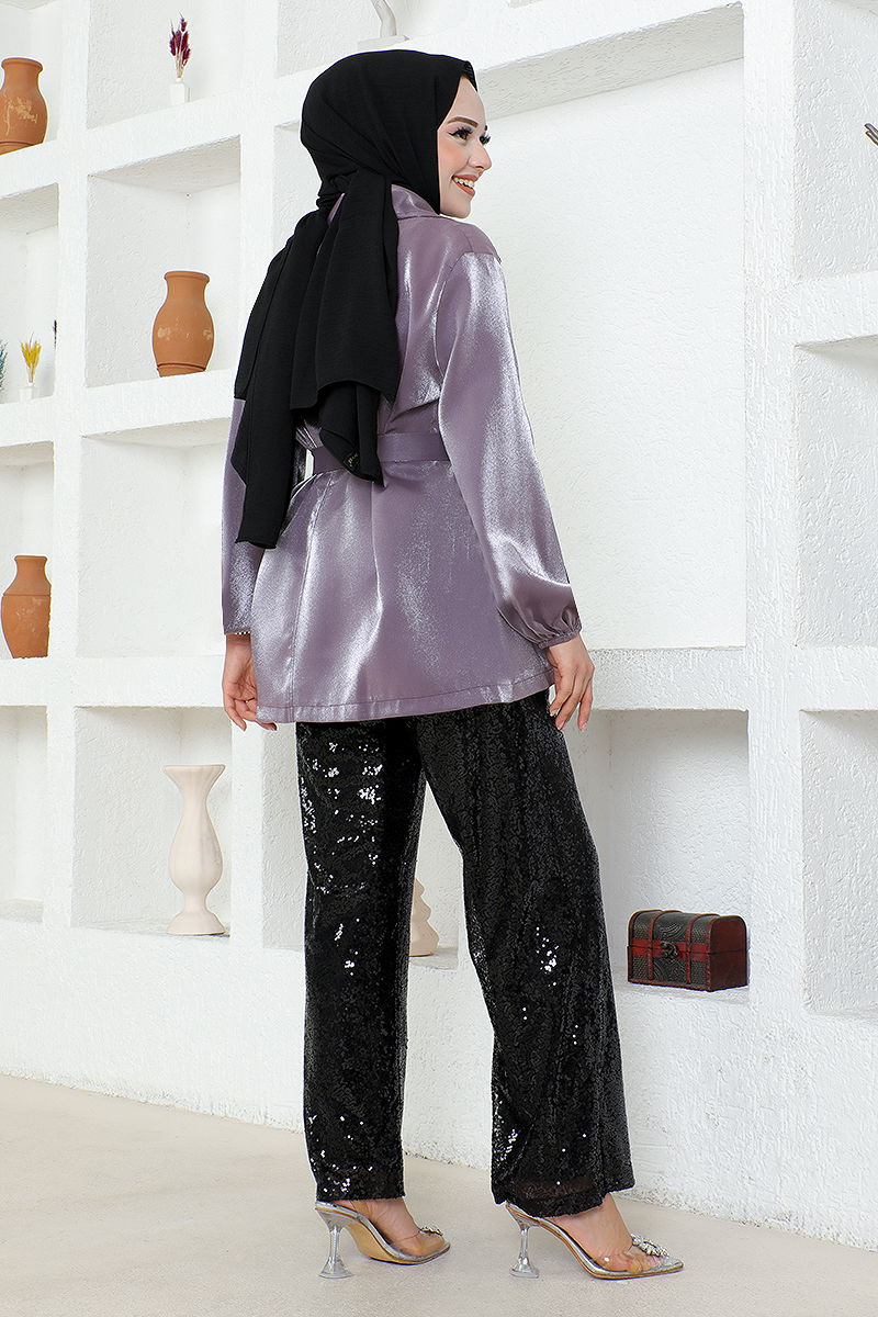 بدلة أنيقة بتفاصيل الترتر الأنيقة باللون البنفسجي