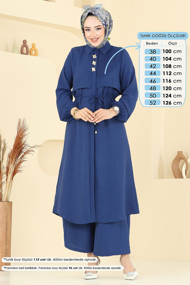 Elena Düğmeli Tesettür Takım, her mevsim rahatlıkla tercih edebileceğiniz bir kombin modelidir. Aerobin kumaş kullanılarak üretilmiştir ve son derece nazik bir dokuya sahiptir. Gizli düğmeleri ve astarsız tasarımı ile modern ve şık bir görünüm sunar. Tunik ve pantolon set halinde olup, pantolonun lastikli beli ve manşetleri size ekstra konfor sağlar. Bluz sete dahil değildir. 30 derecede hassas yıkama ile kolayca temizleyebilirsiniz. Modelin üzerindeki 38 beden ürün, ideal ölçülerle dikkat çeker. Gömlek yaka ve aksesuar olarak düğmeleri, detayları ile zenginleştirilmiştir.