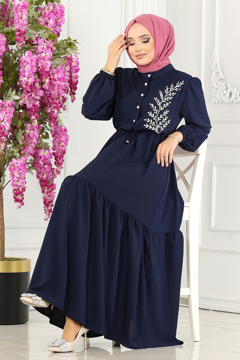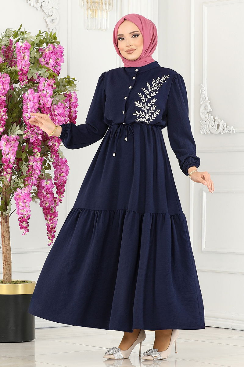 The Embroidered Dress is an ideal choice for women who prefer modest clothing. Suitable for all seasons, this dress can be washed at 30 degrees on a delicate cycle. Made from Aerobin fabric, it is lightweight and breathable. The half-stand collar and half-button details on the front provide a chic look. It offers comfortable wear with a lining-free design, elastic and tie-up cuffs. The embroidered details add an eye-catching appearance. The model is size 38 with measurements: height 165 cm, chest 88 cm, waist 68 cm, hips 99 cm, and weight 56 kg.