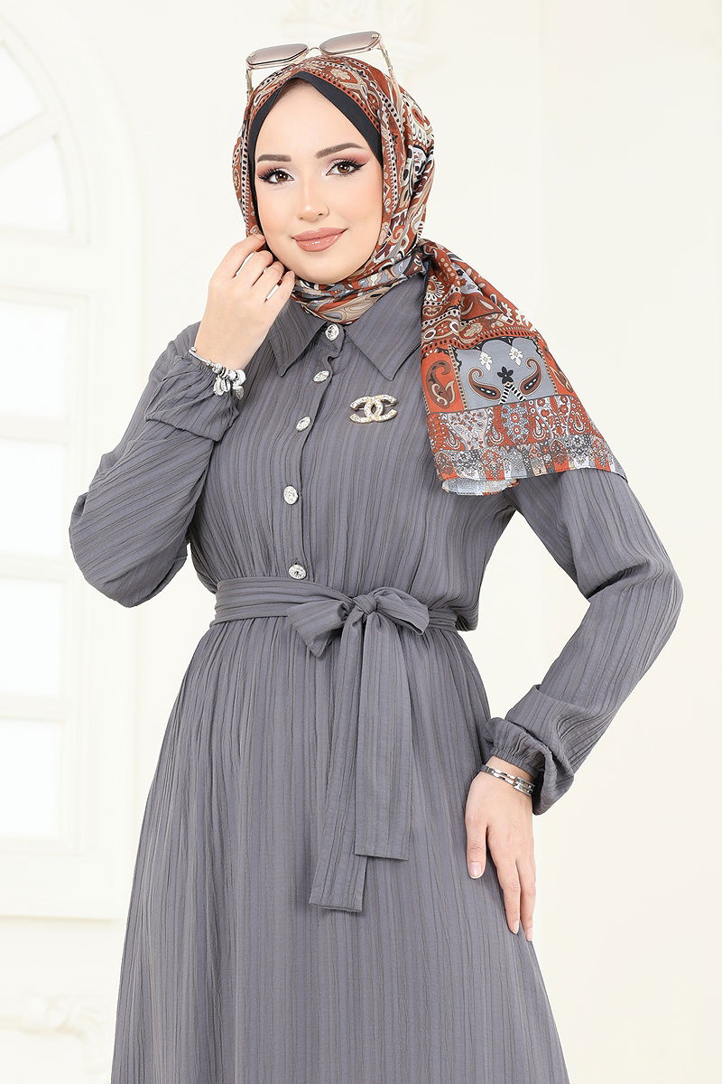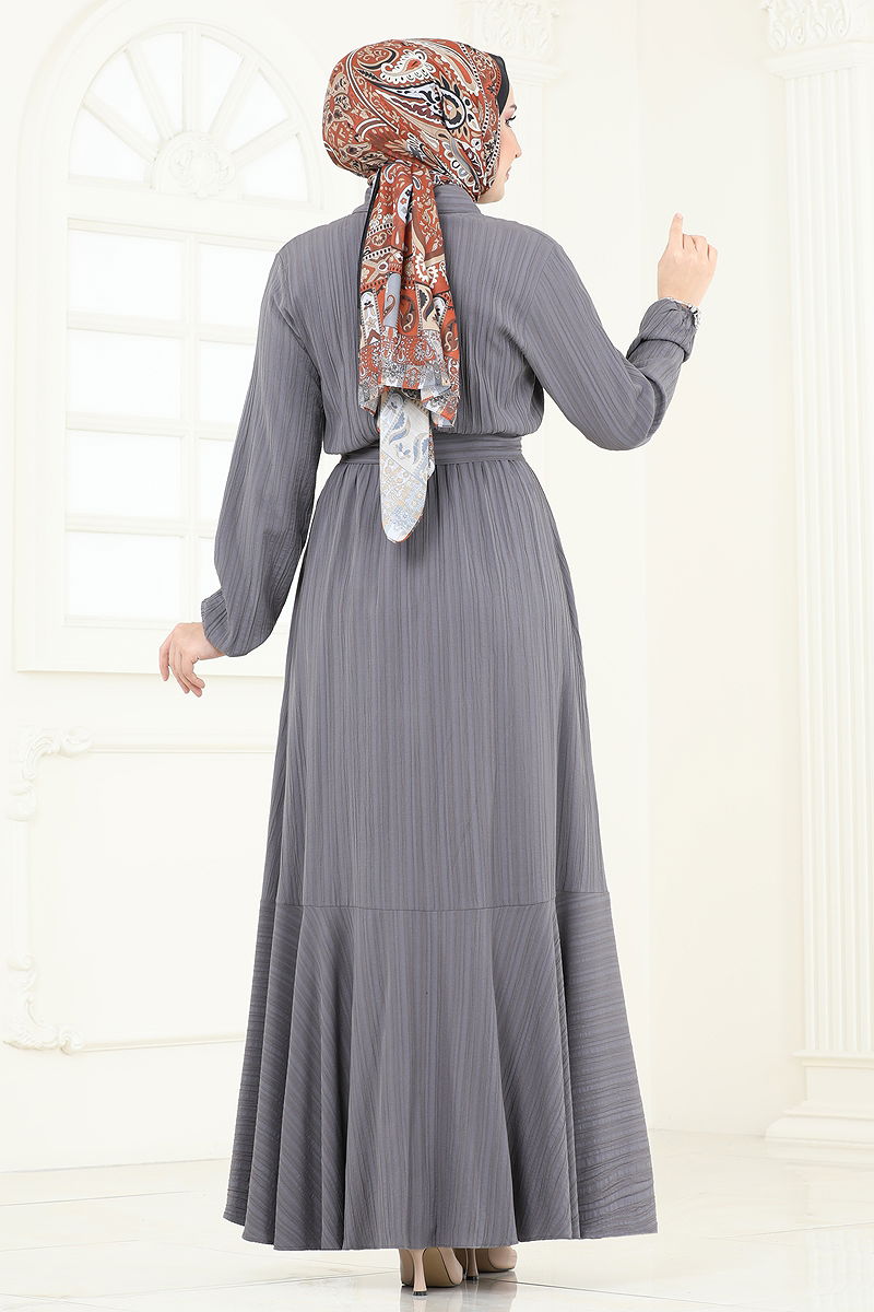 Eteği Fırfırlı Kemerli Elbise Antrasit