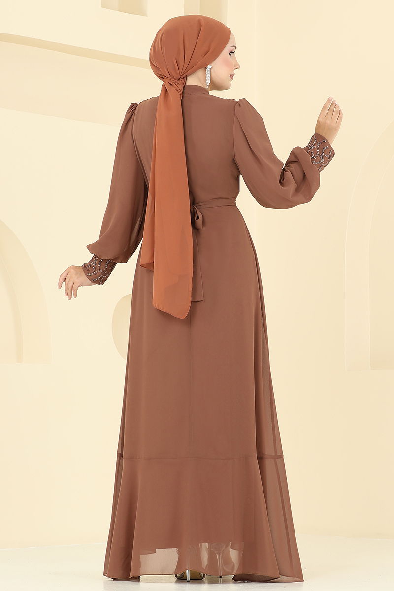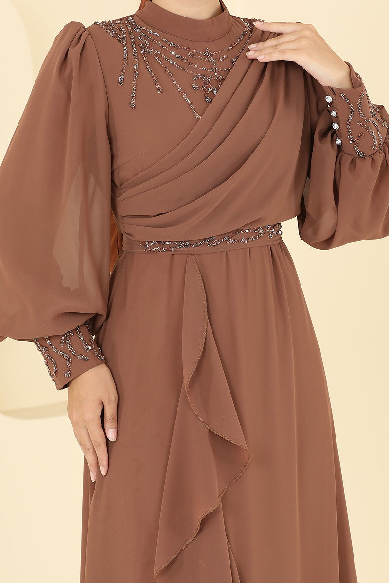 Elegantly designed, the Ruffled Skirt Stoned Evening Dress is an ideal choice for your special occasions. This timeless modest piece can be comfortably worn in every season. Made from chiffon, it is light and comfortable. Its half-mandarin collar and zipper back make it practical to wear. Lined for an enhanced experience, it comes with a belt that can be styled differently or removed as desired. Shine bright with eye-catching stone details. Dry clean only is recommended.