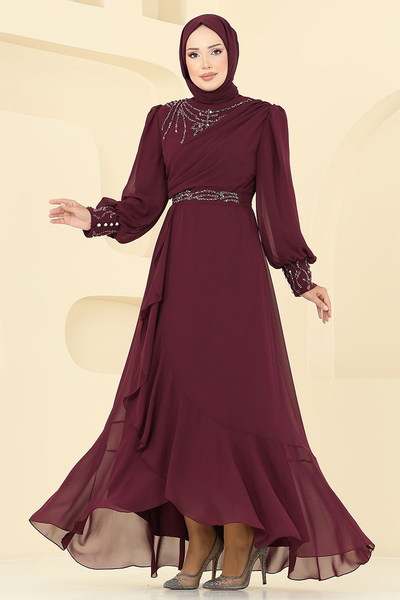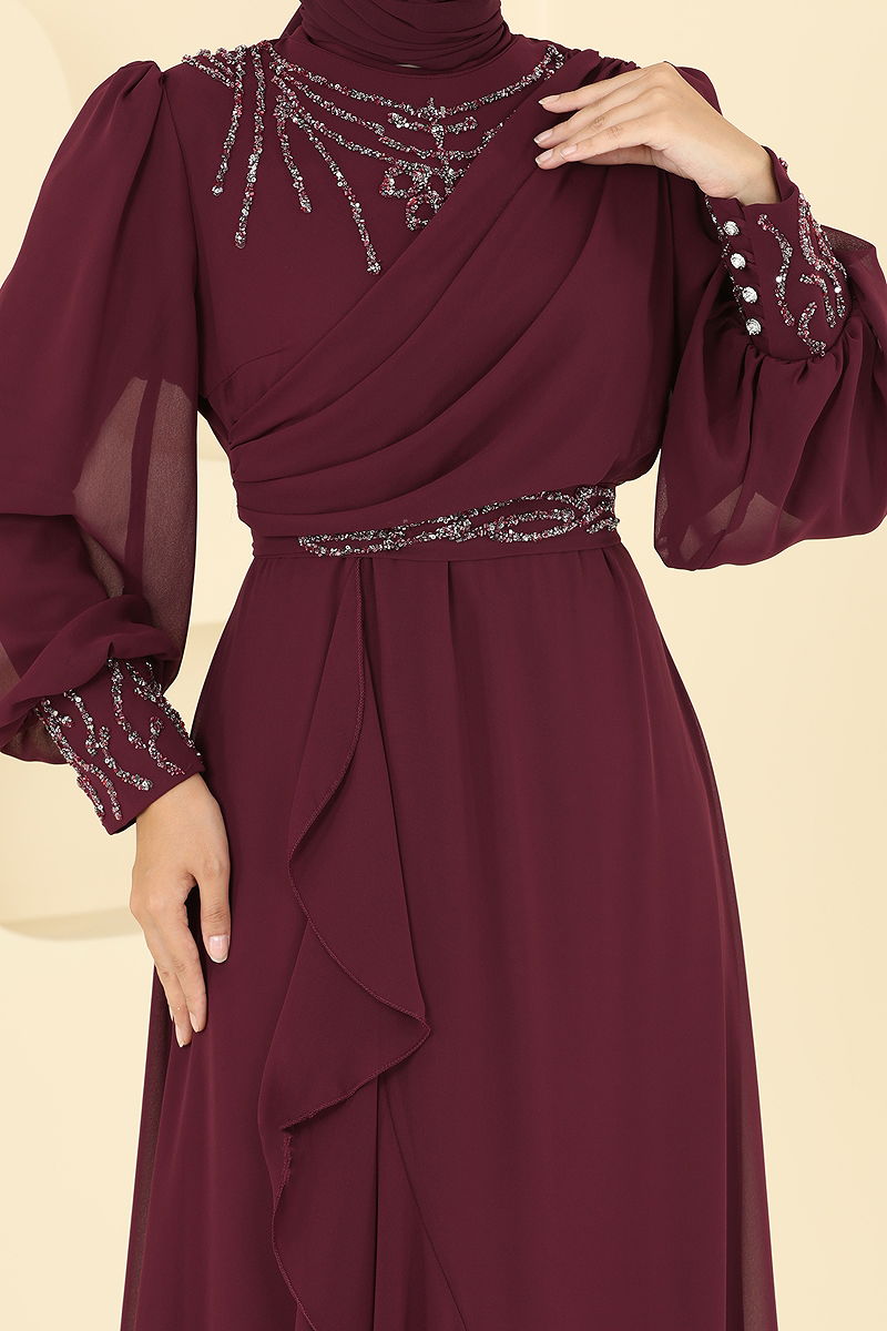 Eteği Fırfırlı Taşlı Abiye Bordo