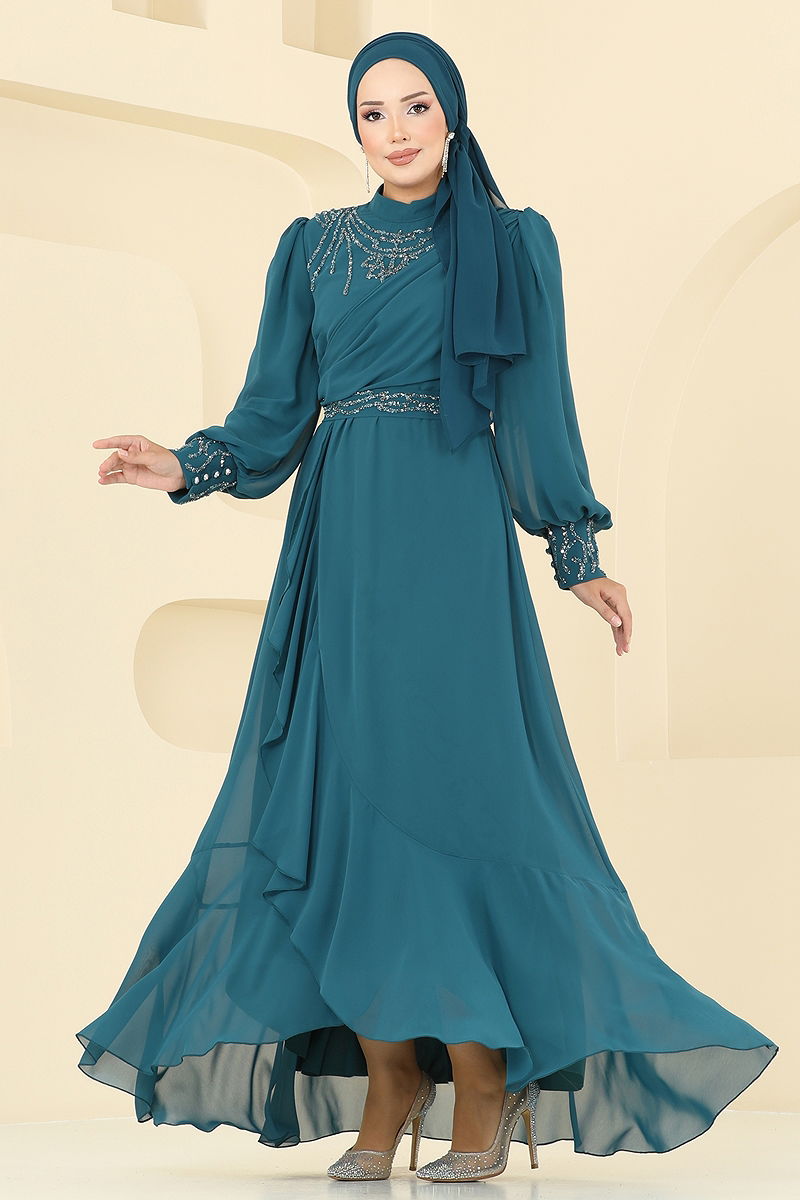 Eteği Fırfırlı Taşlı Abiye 8088AB368 Petrol
