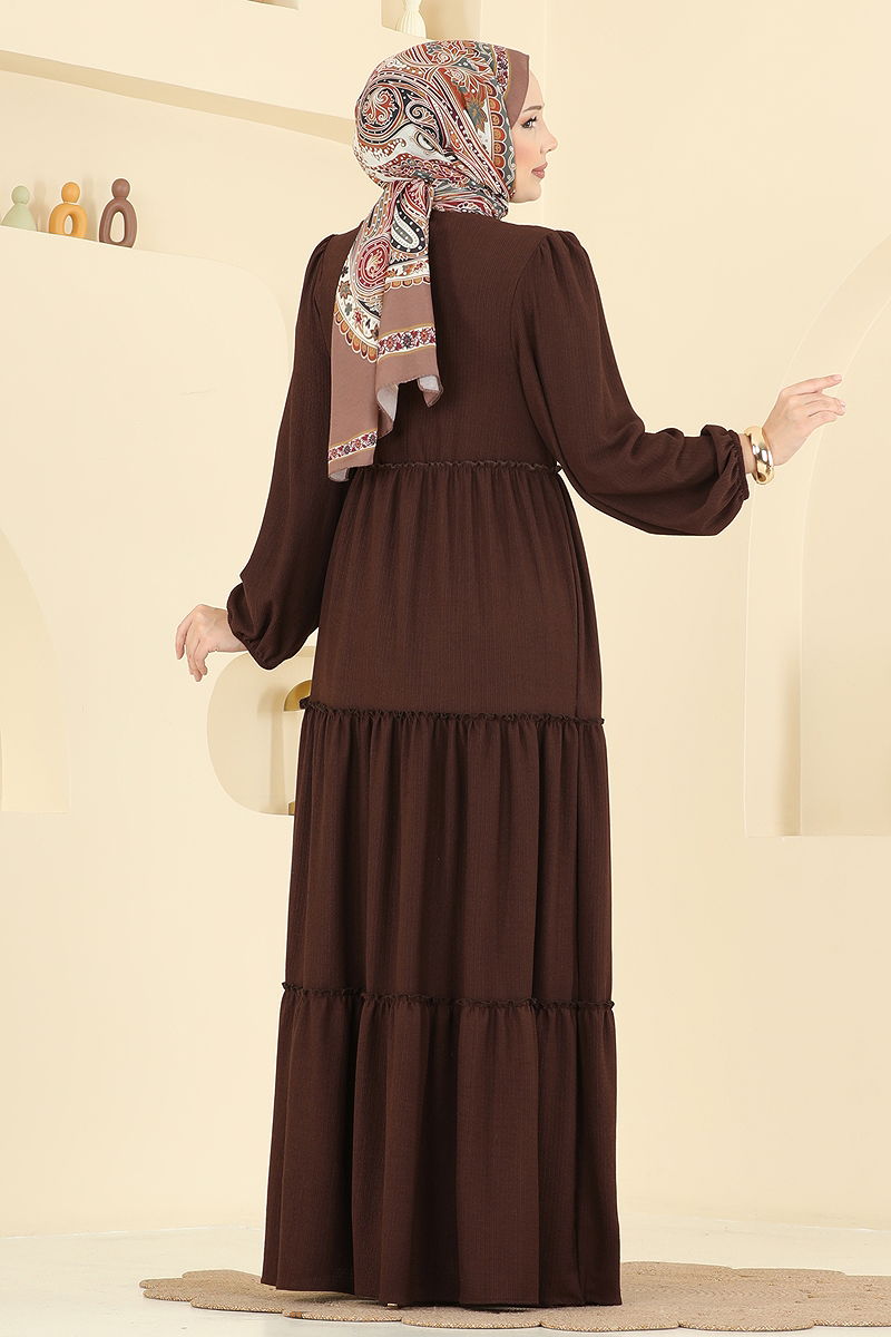 Eteği Katlı Bürümcük Elbise 3300BLU797 Kahve