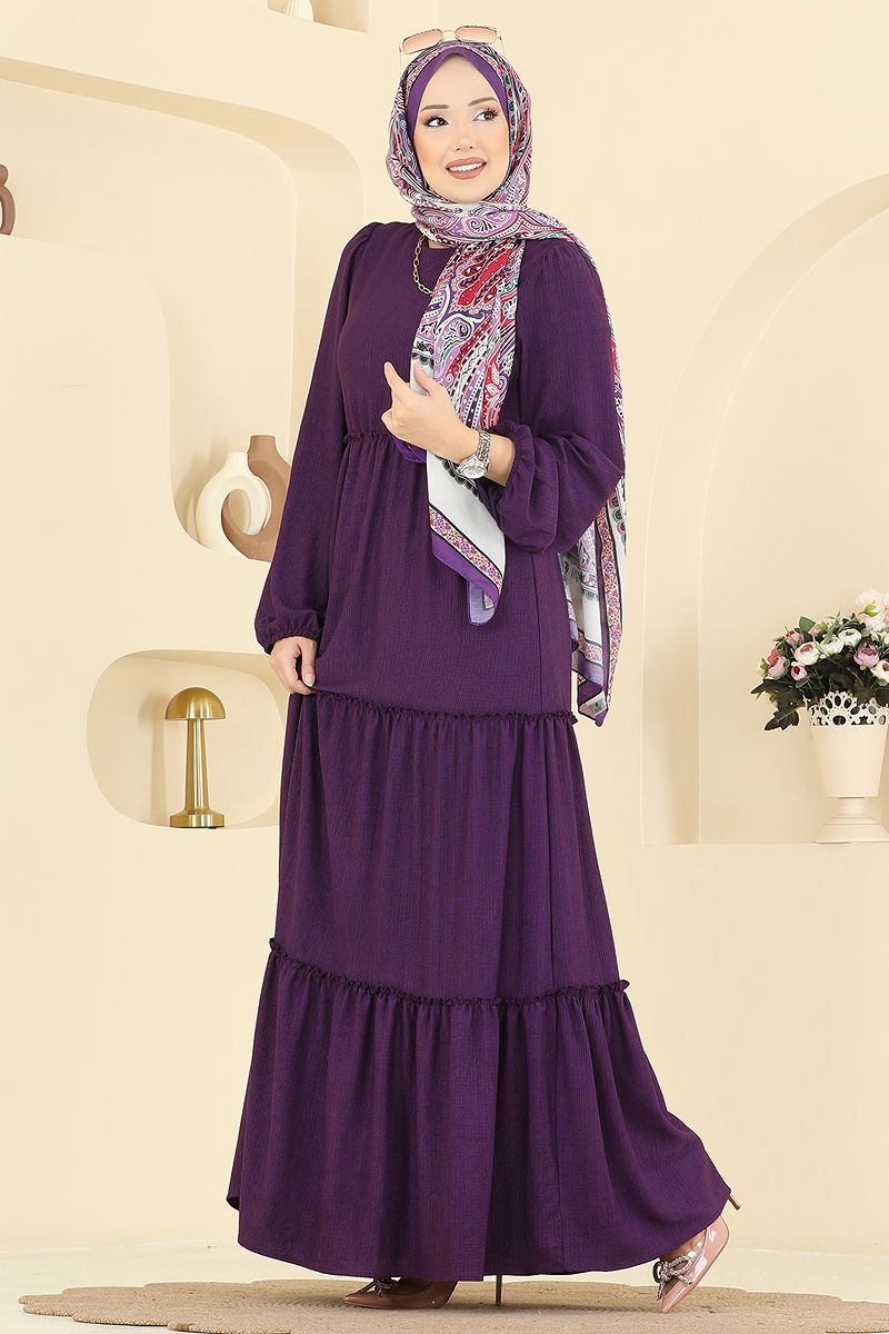 Eteği Katlı Bürümcük Elbise 3300BLU797 Mor